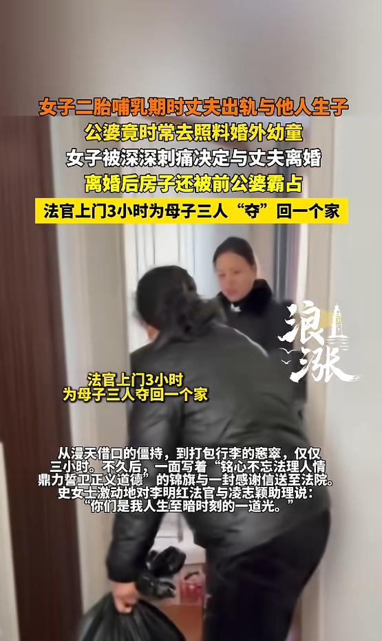 江苏苏州,一女子在二胎哺乳期发现丈夫出轨,对方竟还生下了私生子!更让她心碎的是,公婆不仅不站在她这边,反而天天跑去照顾那个婚外幼童。女子含泪起诉离婚,法院将房子判给了她。可离婚之后,前公婆竟然赖在房子里不走,硬生生把母子三人逼得有家不能回! 早就说过,别以为拿到判决书就万事大吉!这不,2025年的苏州寒冬,零下七度的街头,一个刚生完孩子两个月的女人,就这么被活生生逼到了肯德基过夜。 监控画面令人郁结于心。戴月子帽的史女士面色惨白,瑟缩于冰冷塑料椅上。三岁半的大女儿蜷缩着睡去,怀中还兜着才两个月大的婴儿。她的耳根冻得通红,手里死死攥着一份盖着公章的法院判决书。你没看错,就是那份本该让她重获新生的判决书,此刻却成了她流浪街头最大的讽刺。 说起来这事儿简直荒唐到家了。2025年初,史女士还有个看似完整的家,结果发现丈夫不光婚内出轨,还在外面生了私生子!更绝的是公婆的操作——这两位老人压根不觉得儿子有错,反而天天准时跑去"外室"那边,冲奶粉、换尿布,伺候那个没名分的私生子坐月子,伺候得那叫一个周到。 可对家里的亲孙女和刚出生的亲孙子呢?冷淡得跟路人似的。这种血缘算术,看得人通体发凉。 2025年中旬,史女士抱着襁褓里的儿子,牵着懵懂的女儿,正式起诉离婚。证据摆在那儿,铁证如山,法院很快判了:准予离婚,共同房产归史女士所有。按理说,这事儿到这就该结束了吧? 结果你猜怎么着?前公婆压根不搬!不仅不搬,还换了锁,把史女士的东西全扔出去,甚至还贴上春联,一副"这房子就是我的"的架势。面对执法,这对老人有一套循环往复的拖延逻辑:一会儿说"没地方放东西",一会儿说"买票需要时间",最后甚至理直气壮地反问:"住了这么多年,凭什么走?" 就这么着,一个还在哺乳期的母亲,硬生生被逼到了肯德基的塑料椅上过夜。 2025年底那个声音如风中残烛的求助电话,惊动了法官助理凌助理。这种在法律边缘徘徊的"家务事"往往最难执行,但这一次,法律不再只是卷宗里的条文。凌助理直接推开了那扇紧闭的家门,开始了长达3小时的正面硬刚。 她没废话,直接拆解继续赖着的代价:从《民法典》里无权占有的返还规定,到《治安管理处罚法》里寻衅滋事的拘留后果,再到拒不执行判决罪的刑事门槛。法律的威慑力,在这一刻变得可视化。为了彻底击碎赖皮的心理防线,凌助理甚至自掏腰包提供了两晚住宿作为缓冲。这不是妥协,而是剥夺了对方最后一点"没地方住"的挡箭牌。 三小时后,两位老人灰溜溜地卷铺盖走人,临走前还不甘地丢下一句毒咒:"她一个女人,能撑多久?" 这种充满傲慢的偏见,很快就在时间面前败下阵来。今年春节前夕,法官们再次登门回访时,屋子里升腾的烟火气已经给出了答案。阳台上晾着大大小小的衣物,厨房里煮面的热气糊满了窗玻璃,小儿子正摇摇晃晃地在地毯上学步。 史女士现在的状态透着一种劫后余生的松弛感。她对法官坦言,每晚睡前都会习惯性地把那份判决书压在枕头底下。相比于那张曾经让她满怀期待却最终碎成纸屑的结婚证,这份判决书给她的安全感要厚实得多。 说白了,前公婆这笔账算错了。他们以为时间能磨平法律的锋芒,以为孤儿寡母抵挡不住寒冷。但他们忘了,判决书上的每一个字,都是在为正义撑腰。而这种硬度,足以支撑一个家庭在废墟上开出花来!