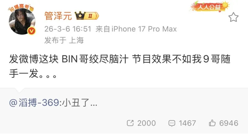 全网都在心疼369...TES官方公告发出后,LPL解说管泽元进行转评369微博:发微博这块,BIN哥绞尽脑汁,节目效果不如我9哥随手一发。