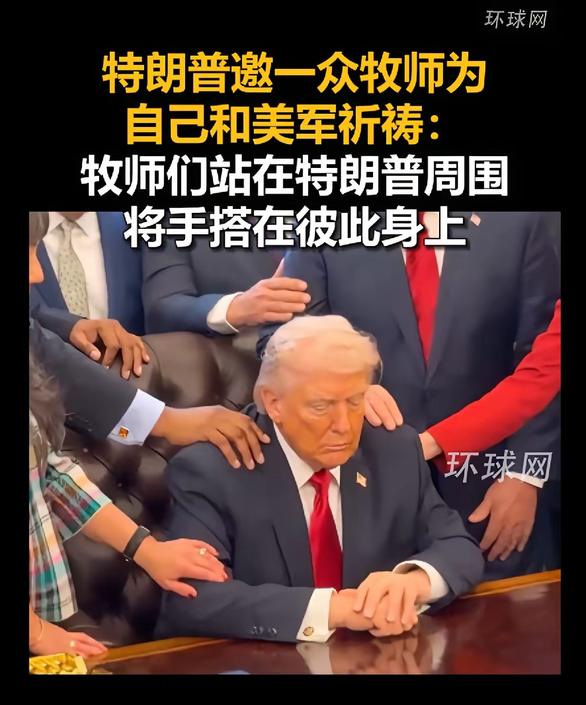 特朗普邀请牧师为自己和美军祈祷,牧师们站在特朗普周边,将手搭载特朗普身上做法事