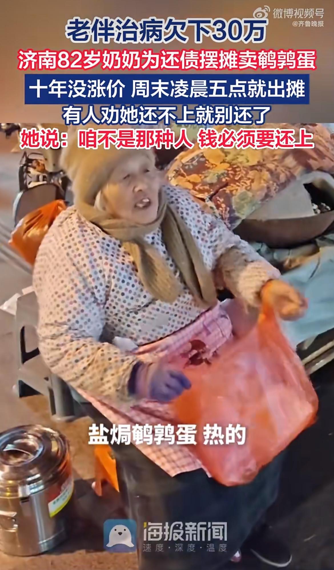 “欠债还钱天经地义!”可要是欠债的是位82岁高龄、身体欠佳还为给老伴治病欠下30万的老人呢?有人劝她别还了,可济南的宋爱玉奶奶却态度坚决:“咱不是那种人,钱必须要还上!”每天傍晚她都裹着棉衣在寒风中摆摊卖鹌鹑蛋。 济南市历下区羊头峪西沟的路口,每到傍晚就能看到一盏暖黄色的小灯,守着一辆装满鹌鹑蛋的电动三轮车。车旁坐着的是82岁的宋爱玉奶奶,她总是裹着厚厚的棉衣,在寒风里不停地吆喝着,卖力推销自家热腾腾的盐焗鹌鹑蛋。 宋奶奶摆摊已经有十多年了,她经常出现在山东师范大学千佛山校区附近。这么大年纪还在外奔波,其实是为了还债。宋奶奶年轻时在医院当护士,老伴曾是一名消防员。两人的缘分始于一场火灾,当时老伴因为救火受伤住院,正好住进宋奶奶工作的医院,两人就这样相识并组建了家庭。到了上世纪八十年代末,夫妻俩通过下海经商,还曾成为人人羡慕的“万元户”。 但生活在后来发生了巨大的转折。老伴患上了严重的膈肌痉挛,这场病一治就是近20年。为了给老伴治病,家里前前后后花掉了上百万元,不仅掏空了所有积蓄,还向亲戚朋友借了30多万元。后来老伴去世了,但这笔巨额的外债依然压在宋奶奶肩上。宋奶奶的儿女身体状况也不太好,为了帮母亲分担,女儿每周五和周六的晚上都会从深夜十点忙活到凌晨五点,专门负责煮蛋。煮一锅鹌鹑蛋要三个多小时,一次得做两锅才能供得上出摊。 宋奶奶自己身体其实也不算好,高血压等基础病一直缠着她。有时候心脏不舒服,她就吃点药硬扛过去,缓一缓接着出摊。身边有人看她辛苦,劝她年纪大了,那些钱实在还不上就算了。但宋奶奶的态度特别坚决,她总说自己不是那种欠钱不还的人,只要还活着,这钱就一定要还上。 这些年来,宋奶奶卖的鹌鹑蛋价格一直没涨过:10块钱能买27个盐焗的,16块钱能买30个骨汤麻香的。因为价格公道人又实在,附近很多学生和居民都成了她的老顾客,大家也都知道她的难处,经常特意多买一些来帮衬她。有的学生每周都来买两盒,还说是帮同学带的,这些小小的善意让宋奶奶在寒夜里觉得特别暖心。 到现在为止,宋奶奶还有20多万元的债没还完。虽然每天摆摊的收入对于几十万的债务来说看起来不多,但宋奶奶觉得只要在动,就在往目标靠近。她甚至还想过,等以后有时间了要把自己的这些经历写成故事。对她来说卖蛋不只是为了还钱,更是为了那份沉甸甸的情谊和做人的底气。 在我看来,宋奶奶不仅仅是在还一笔金钱上的债,她其实是在用行动守护着一种名为“诚信”的做人准则。在82岁的高龄,面对生活给予的重击,她没有选择逃避,这种坚韧和担当,远比那30万外债更让人震撼。如果你也为宋奶奶的坚持所动容,请点赞转发这篇文章,让更多人看到这份了不起的诚信,关注我,一起见证这份温暖的守望。年底的快乐是卡罗拉给的 问界M9祝您新年手到福来 威兰达AIR权益价13.78万 来源:齐鲁晚报