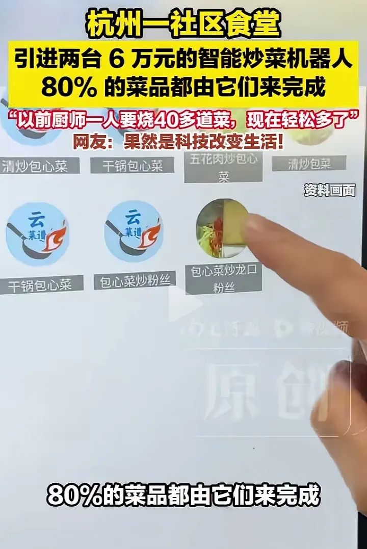 谁能想到机器人率先取代的是厨师。近日杭州余杭区五常街道海曙社区食堂引入两台单价6万元的智能炒菜机器人。机器人通过预设程序实现精准控温、控时,油盐比例误差可控制在0.5克以内,目前承担了食堂约80%的菜品制作。