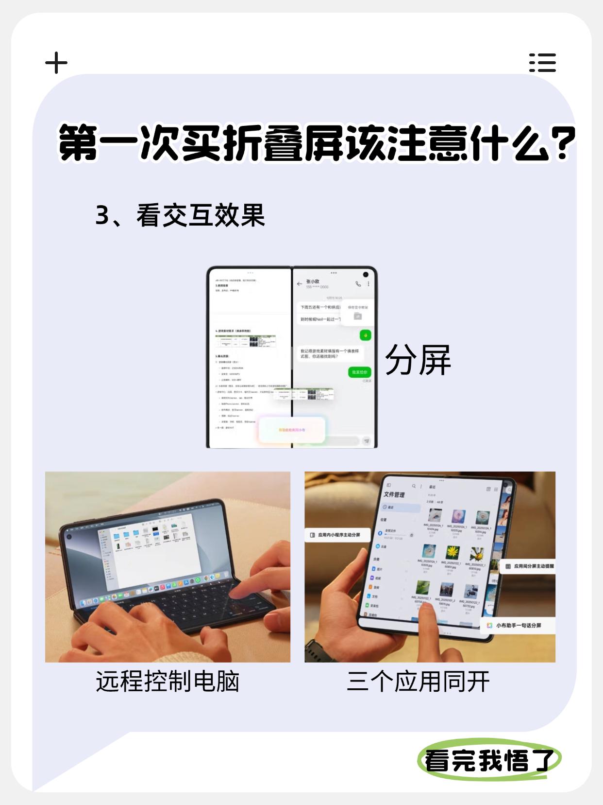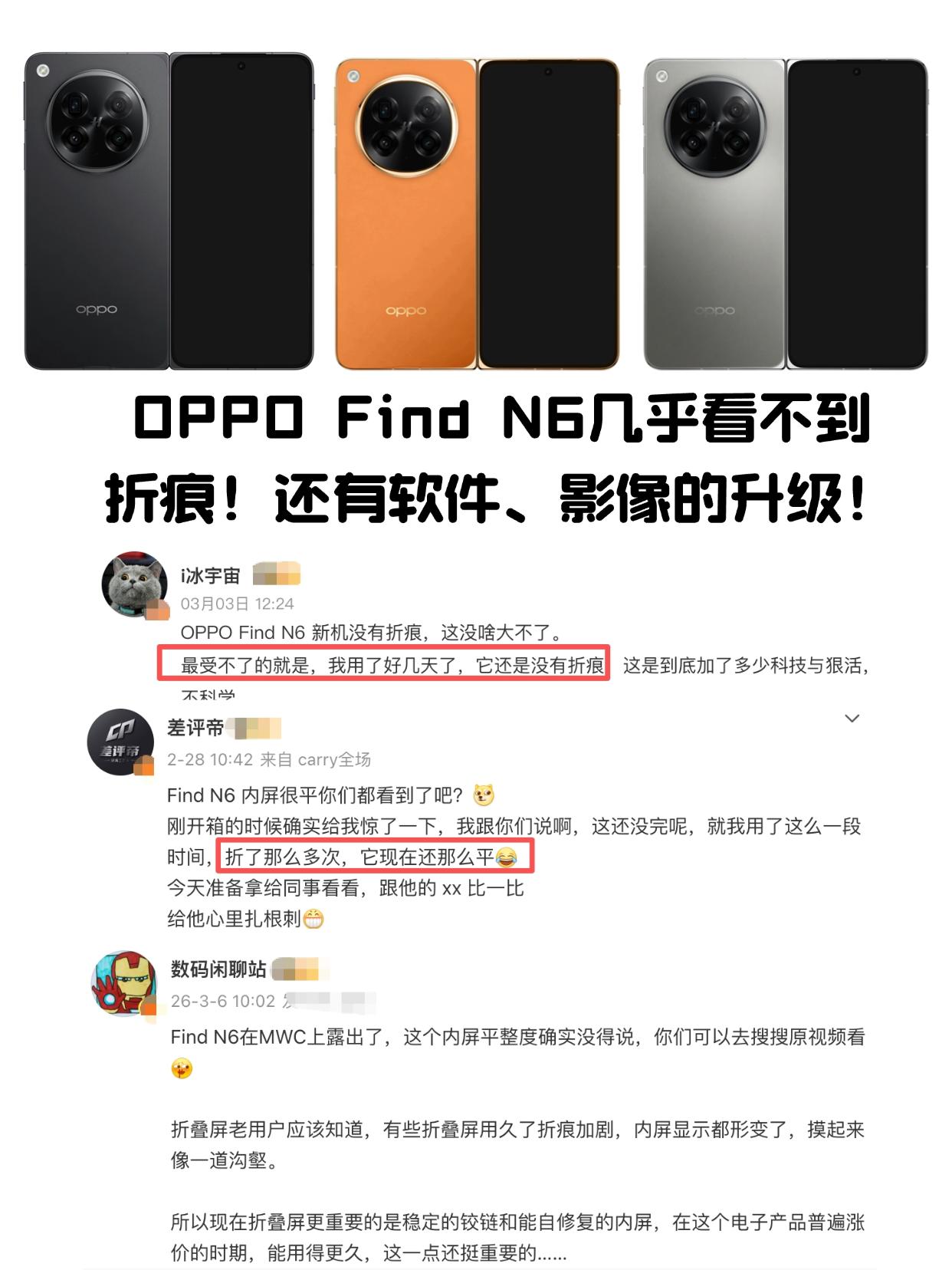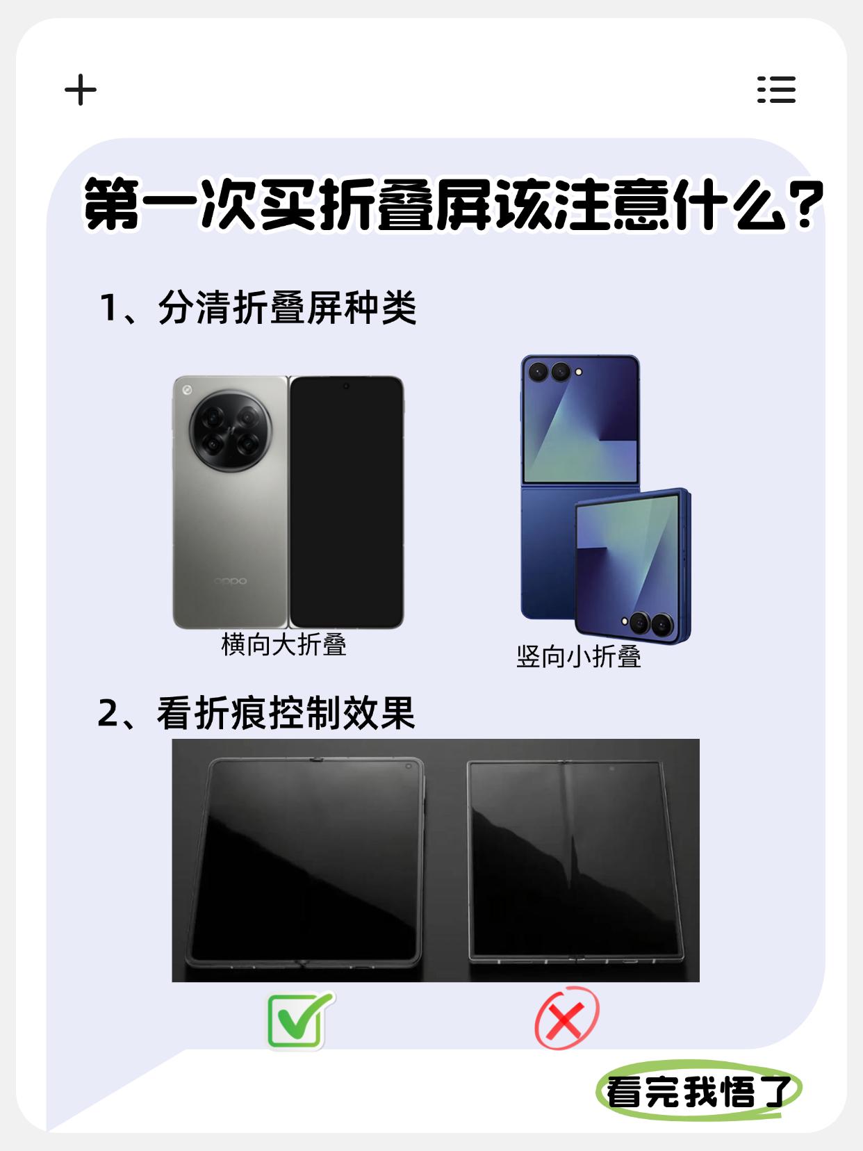 不踩坑买折叠屏必看的三点! 如今折叠屏手机已经发展很多年了,不少人可能在观望吧,那买时需要注意什么?怎么选?今天一篇笔记带大家了解清楚❗️ - 1️⃣分清折叠屏种类 横向大折叠,展开之后的屏幕非常大,很像是小型平板,适合对大屏有需求的,比如上班族、商务人士; 竖向小折叠,像是普通手机中间弯折了一下,整体非常小巧,同时造型时尚好看,适合女生用户; - 2️⃣看折痕控制效果 特别是想使用折叠屏很久的,折痕控制真的得注意了,目前视觉无折痕的折叠屏有两家被曝光了,一是9月的苹果折叠屏,二是马上发布的OPPO Find N6,有博主提前用上了,说用了好几天还是几乎看不到折痕,在MWC上好多老外体验了,也是看不出折痕,甚至苹果也在学OPPO这个黑科技! - 3️⃣看交互效果 折叠屏的优势就是那块大屏,但要发挥效果得看软件交互做得怎么样了?如分屏、AI使用等,目前像是OPPO就不错,Find N5推出了远程控制电脑和全景虚拟屏,据说Find N6新加了AI手写笔,还升级了窗口交互体验,使用效率会更高,你们猜猜有什么新功能?分屏方面吗? - 总的来说,目前折叠屏已经越来越完善了,特别是今年可能是折叠屏大屏,如OPPO Find N6首发无痕折叠技术,2亿像素哈苏四摄和AI手写笔带来全面升级,目前已经开始预约了,据说盲定氛围很热烈,看来终究是关心用户最在意什么的产品更得人心~ 折叠屏手机 手机数码 智能手机 一起聊数码 OPPO OPPOFindN6 苹果折叠屏 手机涨价