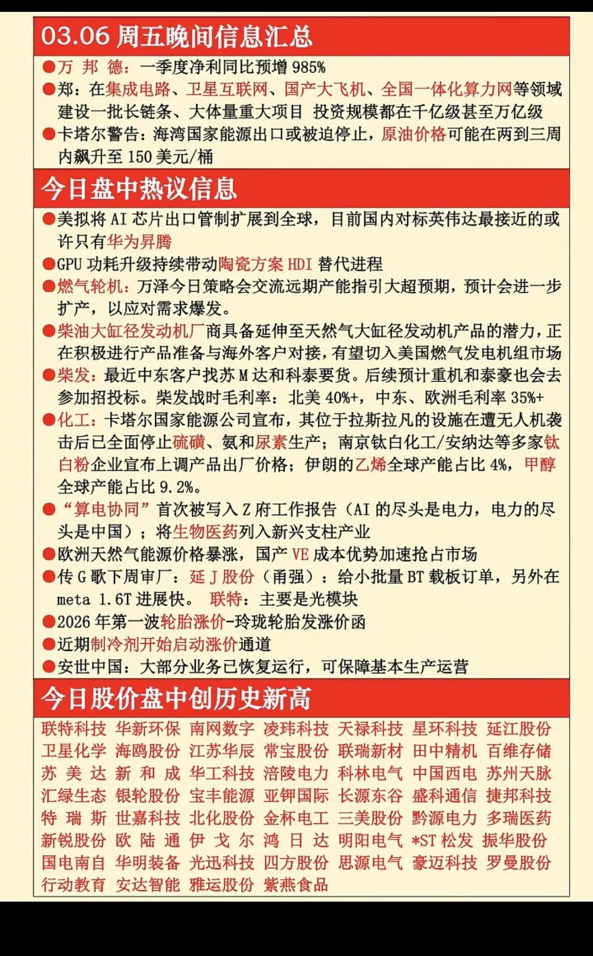3月6日,周五晚间A股市场信息分析!!! 3月6日晚间,市场信息呈现多维度驱动特征。宏观层面,我国将在集成电路、算力网等领域布局万亿级重大项目,为科技与高端制造板块注入长期增长动力;同时“算电协同”首次写入政府工作报告,凸显AI与电力产业的战略协同价值。 行业层面,地缘冲突推升原油与化工品价格预期,卡塔尔能源设施遇袭导致硫磺、尿素等供应中断,钛白粉、制冷剂等化工品开启涨价通道;海外AI芯片管制升级,加速国内华为昇腾等替代进程,GPU功耗升级也带动陶瓷HDI替代提速。 此外,万邦德一季度净利预增985%,多只个股盘中创历史新高,市场情绪偏暖。短期需关注能源化工涨价链与国产替代主线,同时警惕地缘冲突带来的价格波动风险!!!