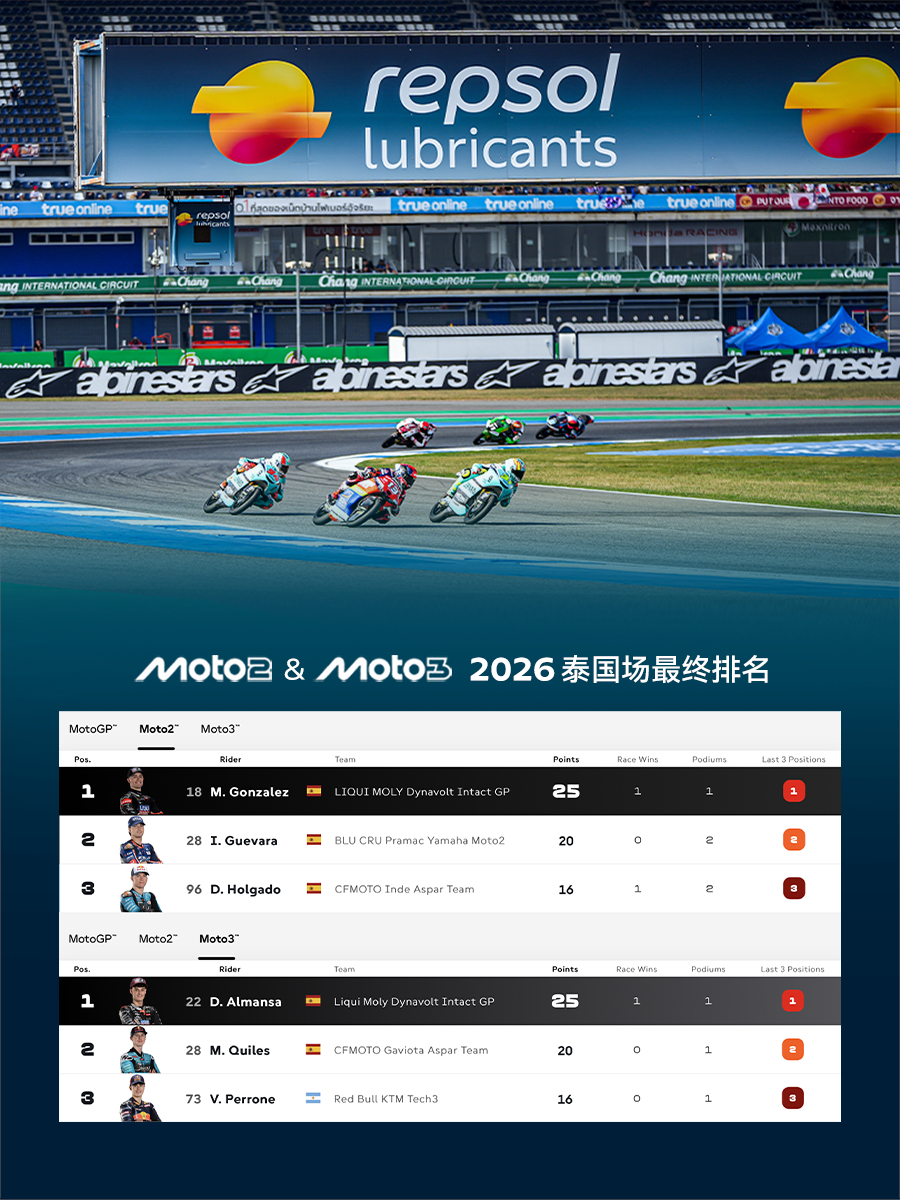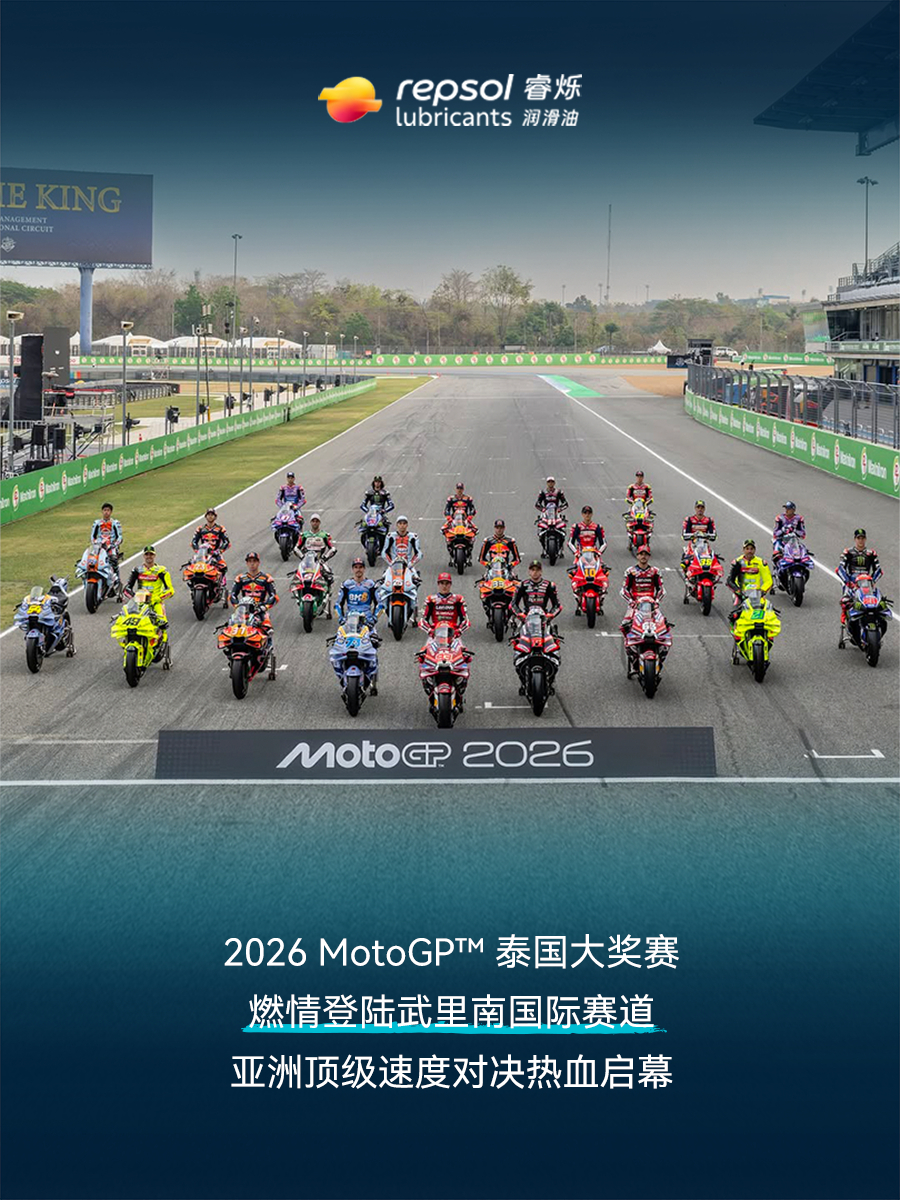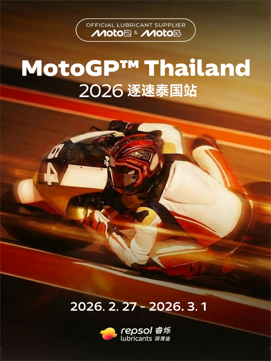 作为2026赛季Moto2™、Moto3™官方独家润滑油供应商,Repsol睿烁全程护航武里南赛道首战。在湿热的热带赛场,Repsol睿烁以赛道同源的润滑科技,为引擎提供极致保护,强化动力传递,让换挡更顺滑,输出更稳定。 从千米长直道到密集弯道,Repsol睿烁用专业润滑实力,见证每一次极限加速与超越,陪伴车手们在武里南赛道全力冲刺,守护每一圈飞驰。
