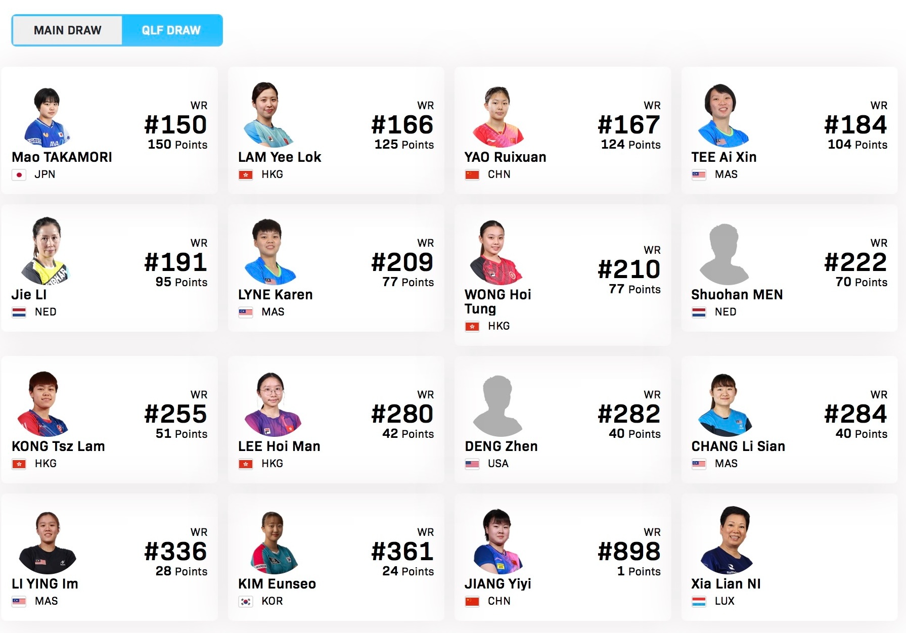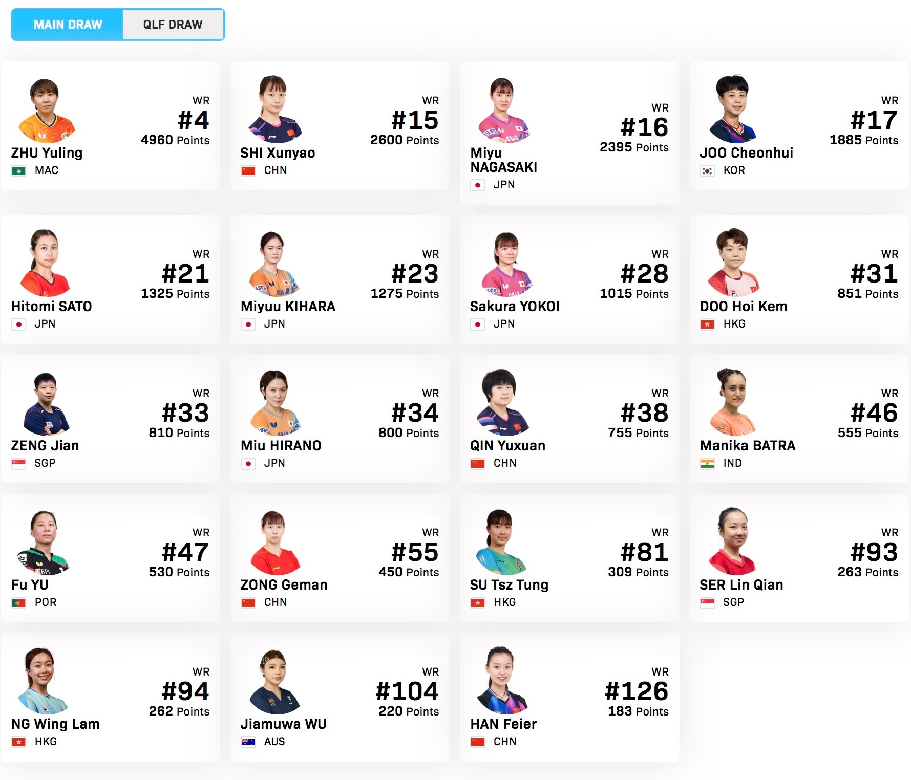 WTT常规挑战赛太原站【女单参赛名单】比赛时间:4.7-4.12正赛:朱雨玲🇲🇴,石洵瑶🇨🇳,长崎美柚🇯🇵,朱芊曦🇰🇷,佐藤瞳🇯🇵,木原美悠🇯🇵,横井咲樱🇯🇵,杜凯琹🇭🇰,曾尖🇸🇬,平野美宇🇯🇵,覃予萱🇨🇳,巴特拉🇮🇳,付玉🇵🇹,纵歌曼🇨🇳,苏籽童🇭🇰,舒麟茜🇸🇬,吴咏琳🇭🇰,吴佳木娃🇦🇺,韩菲儿🇨🇳资格赛:高森爱央🇯🇵,林依诺🇭🇰,姚睿轩🇨🇳,郑爱新🇲🇾,李洁🇳🇱,可人🇲🇾,黄凯彤🇭🇰,门烁涵🇳🇱,江芷林🇭🇰,李凯敏🇭🇰,邓真🇺🇸,郑丽贤🇲🇾,李赢爱🇲🇾,金恩胥🇰🇷,姜依依🇨🇳,倪夏莲🇱🇺