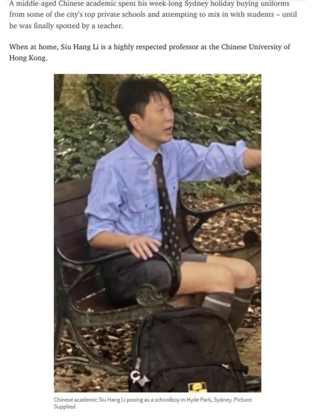 香港中文大学教授校园偷拍男学生,在澳大利亚被捕,想不到一个温文尔雅的大学教授竟然有如此邪恶癖好。这名教授名叫李兆恒,在香港中文大学教授保险精算学。2月27日李教授到达澳大利亚,购买了多所澳大利亚私校的校服,混入学校,其鬼鬼祟祟的样子被老师发现,看到一个中年人穿学生校服的样子很滑稽,于是报警,警察在其手机里发现了大量偷拍的学生照片,后面去酒店搜查,又发现了澳大利亚很多学校的校服。李教授已经不是第一次干这种丑事,这一次被澳大利亚判刑18个月,但是不用坐牢,据说他已经返回香港,继续教职。