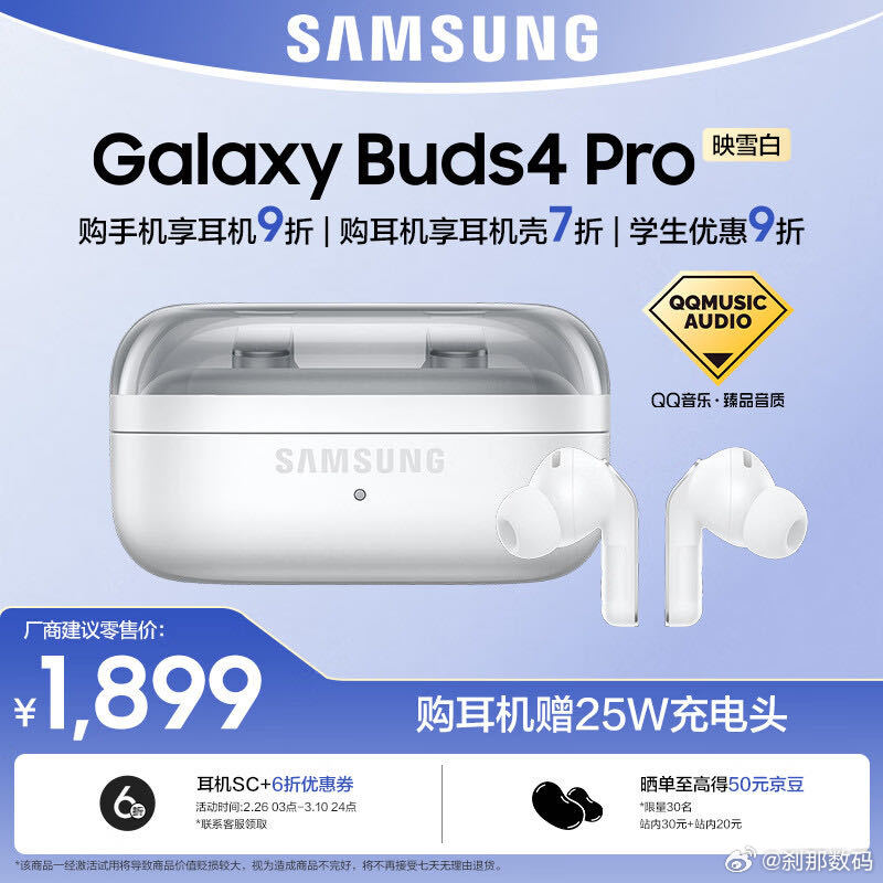 换新机可能得到的日常体验提升不大,但换三星Galaxy Buds4 Pro,你将得到你之前不敢想象的入耳式会有的舒适度、更机灵的自适应降噪、一耳朵就能听出来的音质提升,一耳朵就能听出来它更强、和同价位遥遥领先的实际续航。别怪刹那硬吹,真的很强,我很爱它。 三星(SAMSUNG)【重磅新品】Galaxy Buds4 pro 增强型自...
