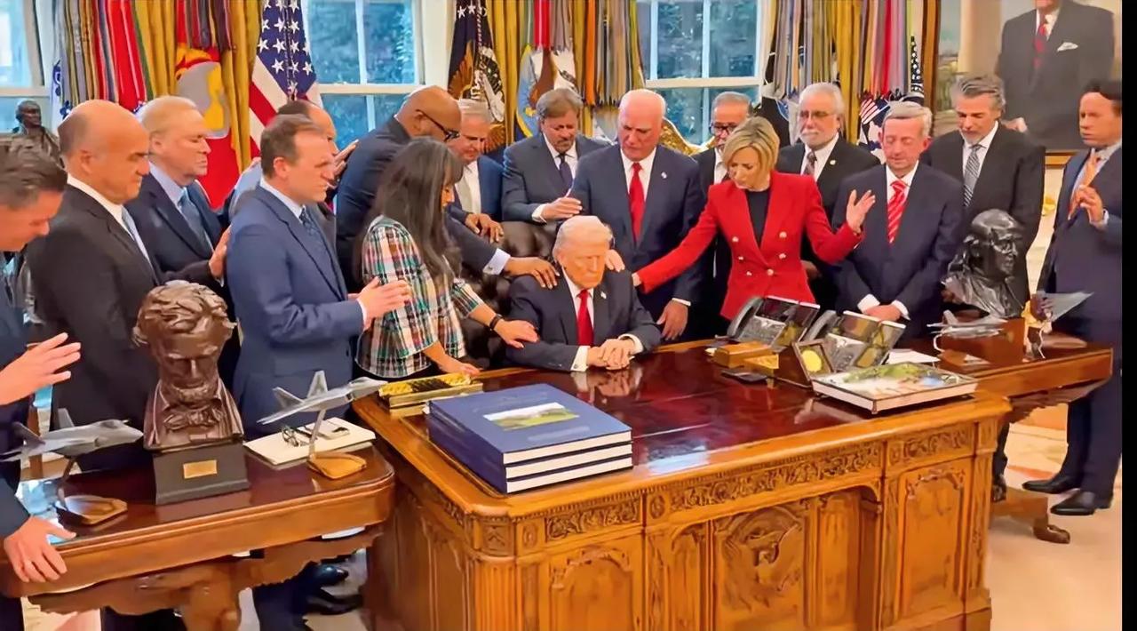 牧师围着特朗普施法“传功”,这张照片够他名垂青史。 美国史上头一个,靠上帝“加持”当总统。 这要是真的,那也太可笑了,一个霸道挑战全世界的人干这事只能说明心虚六神无主了。 平时嚣张跋扈,现在垂头丧气,彻底没招了。 坏事做绝,求神拜佛也没用。 嘴上挑战全世界,身体却很诚实, 又是施法又是求保佑,说白了就是心虚、慌了。