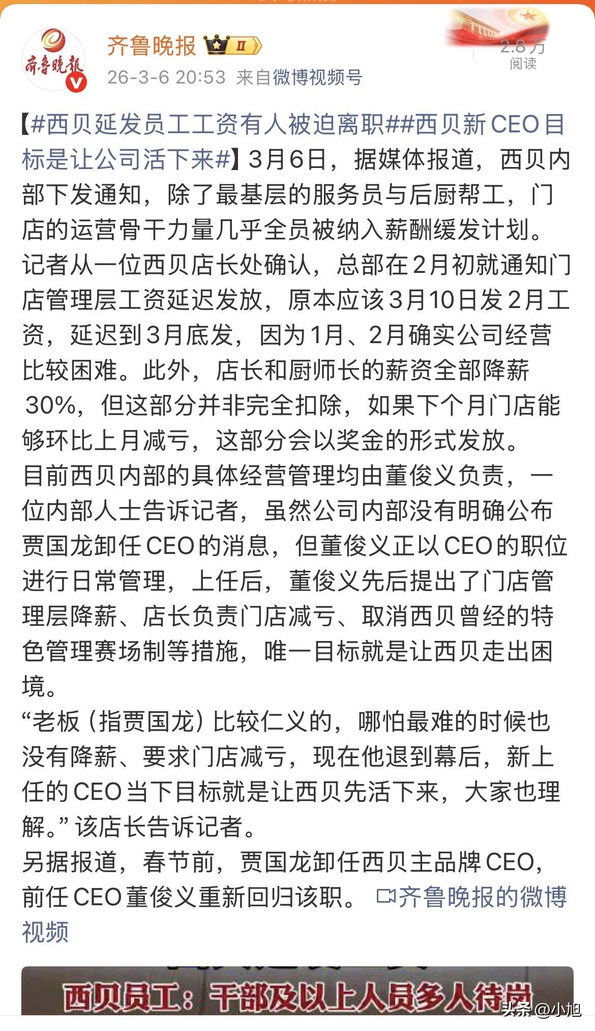 这就有点尴尬了,1月份贾国龙还在朋友圈拍着胸脯说,就算关店102家,员工工资一分钱不会差。结果刚到3月,西贝内部就下了通知,管理层工资延后发,店长厨师长直接降薪30%。 说是降薪,其实也给留了个活口。店长和厨师长三月工资扣掉的那30%,改名儿叫“减亏激励奖金”。门店要是能减亏或者扭亏,这钱不仅补发,搞不好还有多的。有个店长算了一笔账,他店里一月亏了20多万,二月亏10多万,为了拿回那30%的工资,三月拼了命也得把亏损再往下压10万。 这店长也是被逼得没法子,现在招人旺季他愣是一个不招,全职员工从三十七八个减到二十八个。人少了活没少,他就想了个招,前厅没事儿干的时候去后厨帮忙穿串包饺子,后厨忙完了去前厅端盘子洗碗。以前他光管人,现在自己也得上手顶岗。 比降薪更狠的,是工资直接延后发。本来3月10号该发2月的工资,一杆子支到了3月底。涉及的人还不少,城市经理、教练、店长、外卖部长,基本上除了最基层的服务员和后厨帮工,带点“长”字的都被延了。理由也简单,1月2月公司确实太难了。 新上来管事的是个老人,叫董俊义,跟着贾国龙干了三十多年,从学徒一路干上来的。他这次接手CEO,上来就干了几件贾国龙之前下不去手的事:降薪、压着工资不发、还把西贝搞了多少年的“赛场制”给停了。 说起这个“赛场制”,老西贝人都知道,以前门店之间每个月比,比完了发奖金。去年预制菜风波后,贾国龙为了提振士气,改成每周比,全国前30%的门店直接拿12000块。现在全停了,连那些神出鬼没检查服务的“神秘顾客”也没了。 还有个更有意思的细节,西贝之前每店都配几个“欢乐使者”,专门学变魔术、唱歌跳舞哄顾客开心。本来今年3月前要让30%的前厅人员都学会这些才艺,现在培训学校都关了,说是5月1号再看情况。 一位干了12年的店长说得很实在,他学历不高,从服务员干到店长,对贾国龙有感情。现在降薪他也认,就盼着公司能好起来。不过他也承认,现在客流掉得厉害,今年二月比去年同期少了三四成。 有人选择扛,也有人选择走。长沙有个前店长李平,2011年就入职了,从去年9月开始津贴被停,12月又被连续降薪两次。今年2月他实在扛不住了,提了离职,要求补发少发的钱,现在已经在走劳动仲裁。 更有意思的是,西贝这次还给了个截止时间,3月6号晚上11点前离职的,工资正常发。过了这个点,可能就没那么痛快了。有员工私下说,这哪是给选择,分明是在催人走。 贾国龙这次彻底退到了幕后。以前不管多难,他都是冲在前面的那个“大家长”,疫情期间还说过就算贷款发工资也得撑住。这次换人上来干这些“脏活累活”,他自己倒是一句话没说。 不过也不是所有事儿都停了。食品安全检查的力度反而更大了,去年底贾国龙定的“食安置顶”,现在每周都有人到店查,线上监控也是一周一次。每家店后厨装了6个摄像头,对着6个档口,顾客在外面盯着电视看后厨直播。 西贝也在想办法自救。三月要上一批新菜,香椿莜面、砂锅菜,想用新品拉客流。有店长说,总部还在搞菜品创新,一边控制成本一边想着怎么把客人再请回来。堂食不行就靠外卖撑着,争取门店早点扭亏。 一个月前西贝刚拿了融资,新荣记的张勇、前阿里的胡晓明都投了钱。但钱到位了,该关的门店还在关,该走的人还在走。有员工说,现在已经关了不止102家了,有些有包间的大店,谈不下来房租就直接关。 那个被员工说“仁义”的贾老板,1月份还在朋友圈说“我本人没有西贝之外的任何资产,只有北京一套房”,感动了不少人。这才过去两个月,风向就全变了。 有意思的是,西贝那边现在对外统一口径:暂时不方便回应。但内部该发的通知一个没少,该执行的政策一项没落。 一个跟了西贝十几年的老员工说,以前老板总强调“西贝最大的产品是人”,现在这话听着有点讽刺。人被优化了,被降薪了,被延发工资了,但产品还得照卖,门店还得照开。 至于贾国龙本人,据说现在专注干一件事:选食材,到各个原料基地去跑,挑最好的回来做菜。他说自己不适合打造个人IP,“爹味儿”太重。但西贝现在这个局面,缺的恐怕不是好食材。 大家觉得,贾国龙这次退居幕后是真的放权,还是不忍心亲手给老员工降薪? 来源:齐鲁晚报 侵权必删