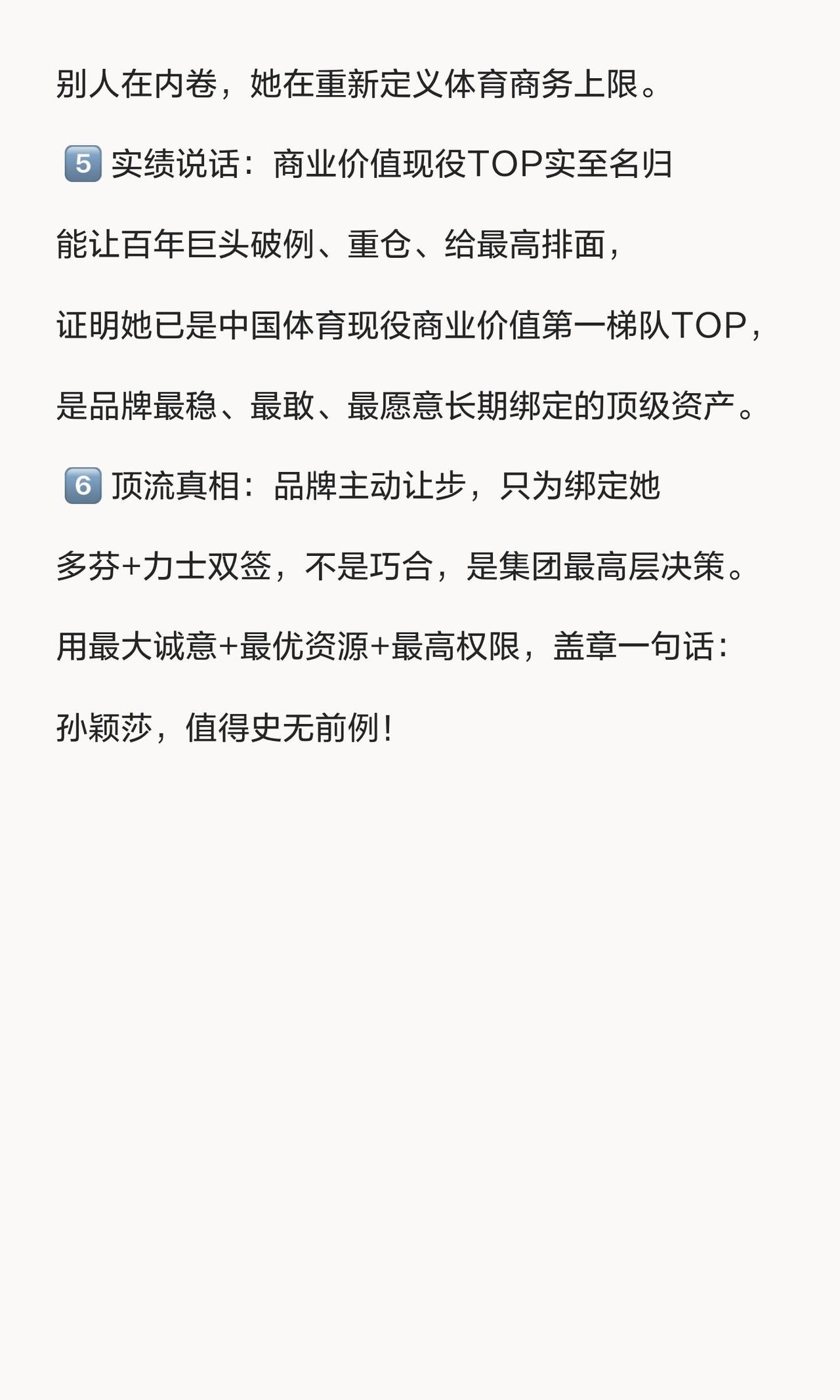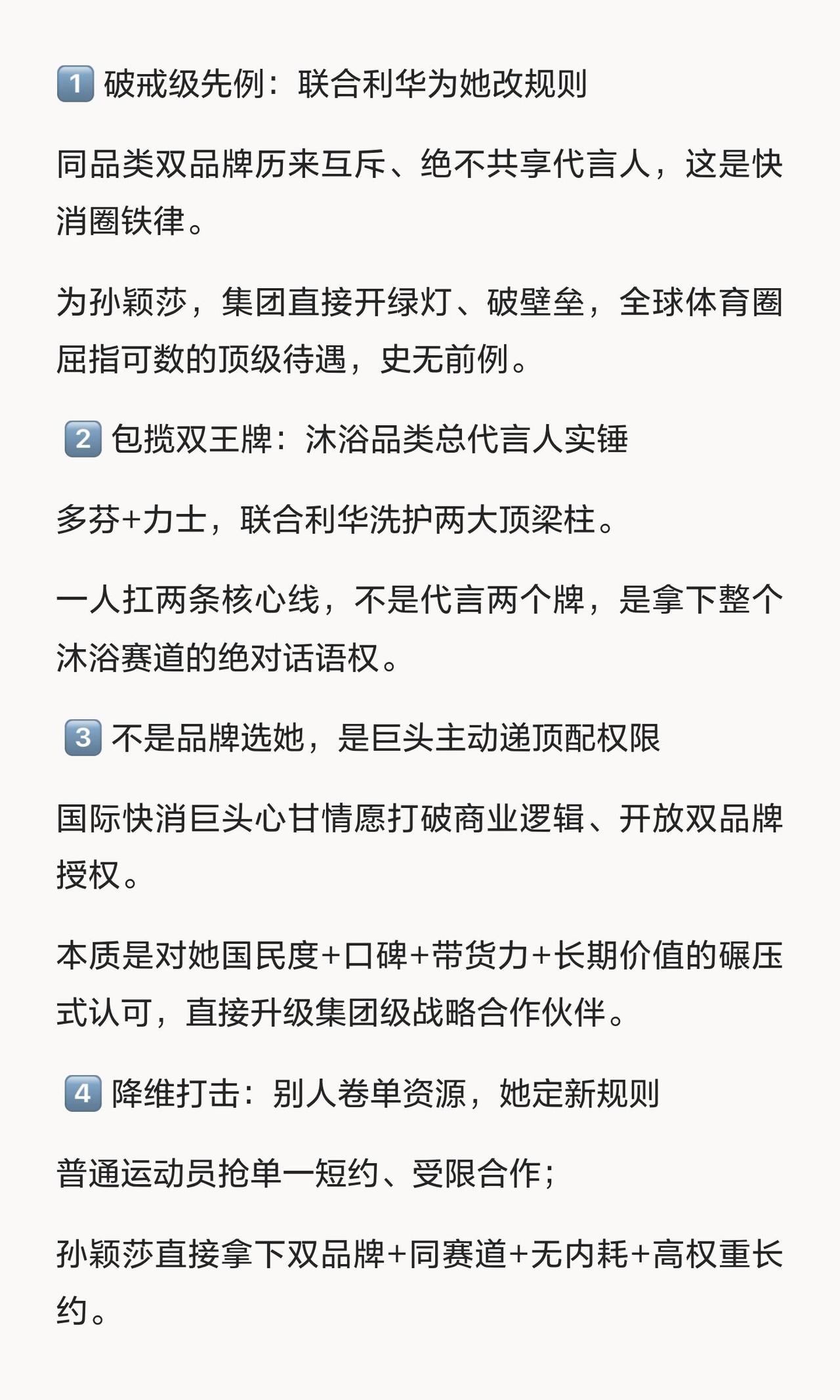孙颖莎的代言可以说是国际巨星的天花板,小小年纪,就拿下这么多大牌! 莎莎和联合利华的精彩,对内真的是认定她! 兼项在代言人上一点没问题,多多益善,孙颖莎是独一无二,努力的劲头是超乎想象的,这是莎莎独属于乒乓球妹的语言体系,2026年节节高,遍地开花!