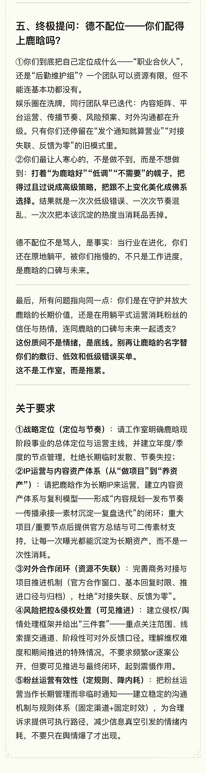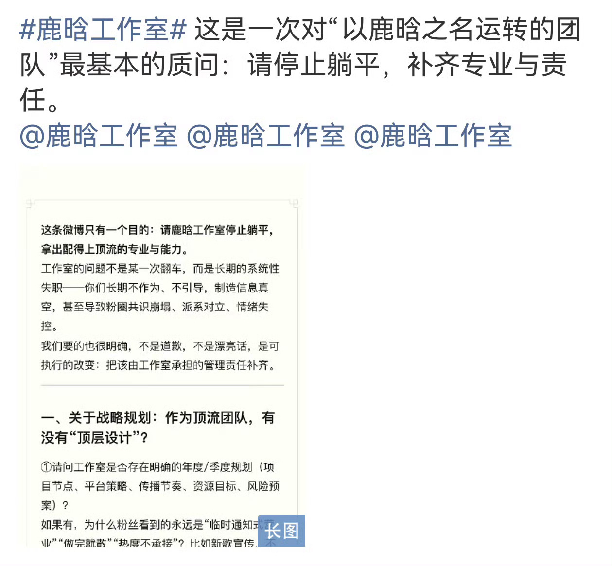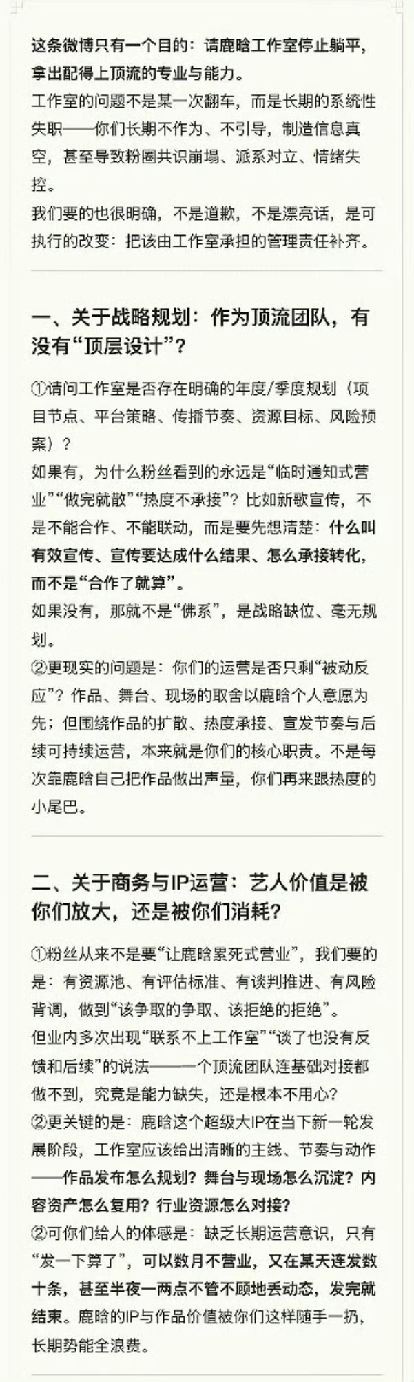 鹿晗粉丝发长文质问工作室:停止躺平,补齐专业与责任!鹿晗工作室