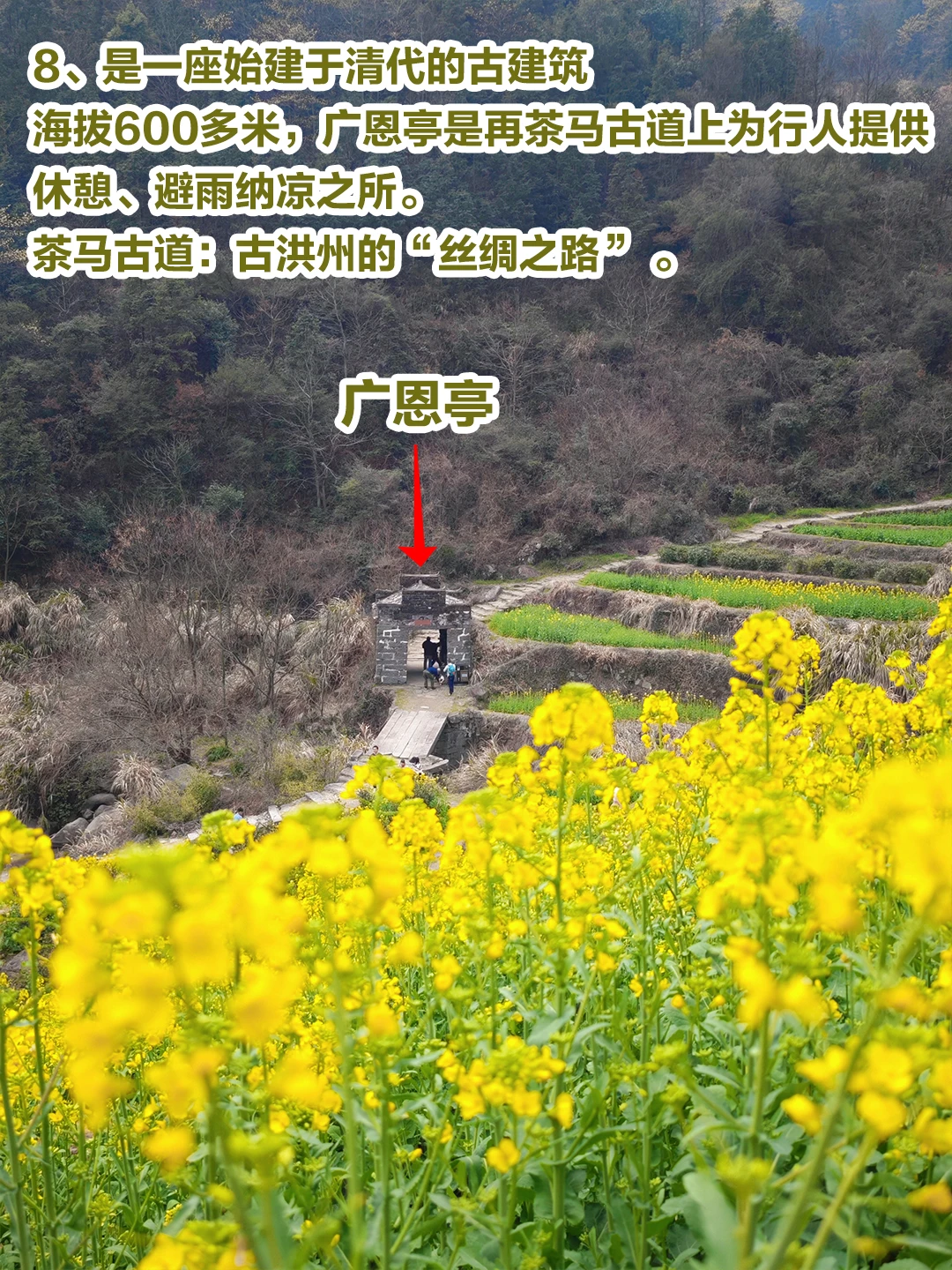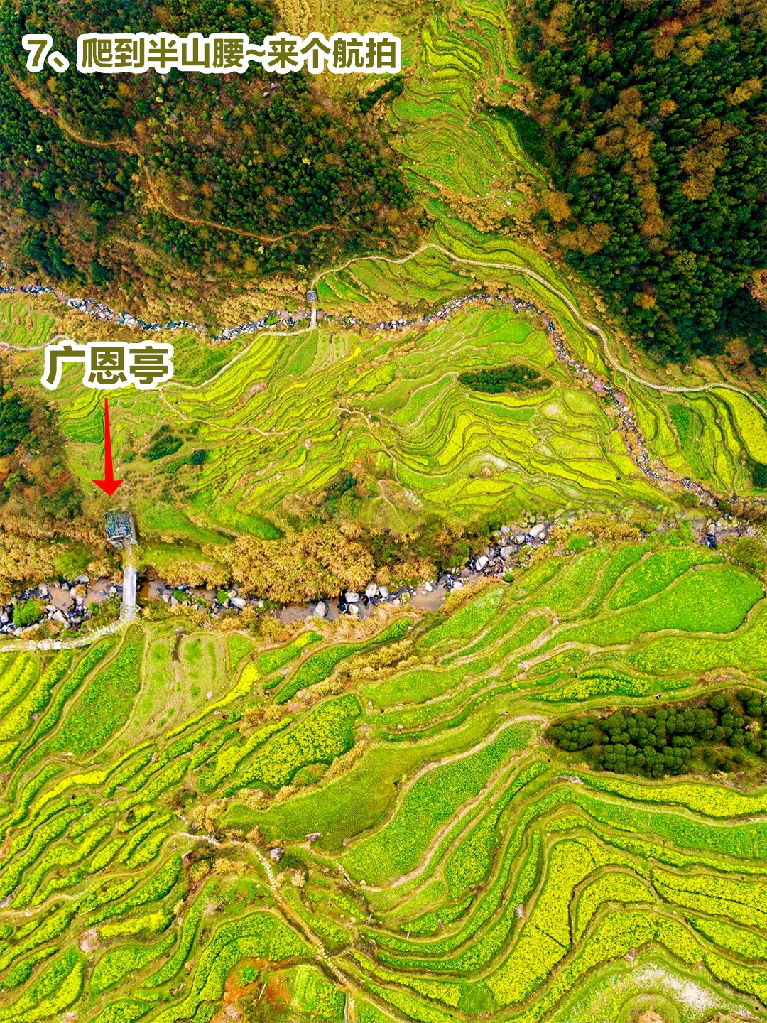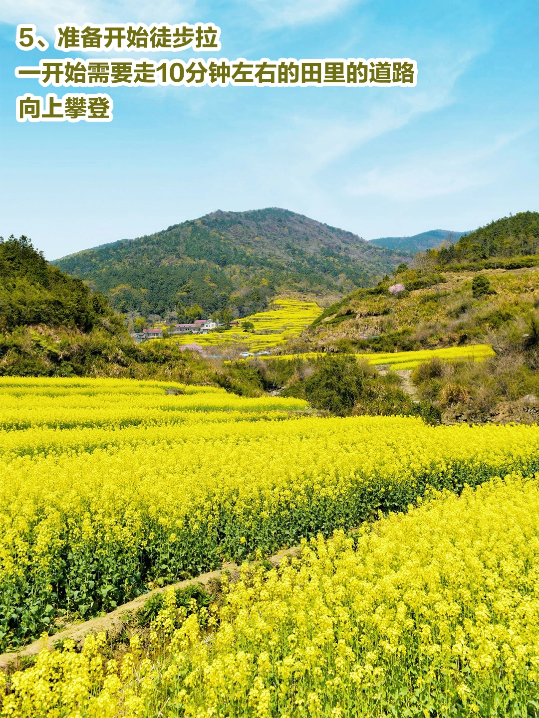 2、建议徒步上至观景台赏花,可以看到梯田油菜花全景还是挺好看的。这是一个上山的过程, 强烈建议大家不要直接导航到牛岭村委会,其实好的风景都在路上,牛岭村委会的风景不如路上。况且下亭子(牛岭村下的一个自然村)在山脚,牛岭村委会在山上,直接到牛岭村委会还得下山去看风景。爬升高度在400多米。