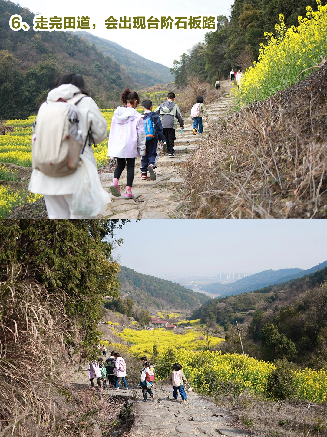 1、图2有保姆级路线图,单程4.95公里,我来回耗时1小时45分钟,具体耗时要看个人,一路的石板路,轻微的泥巴路,有红绳指引,特别特别特别特别适合亲子徒步,视野开阔。