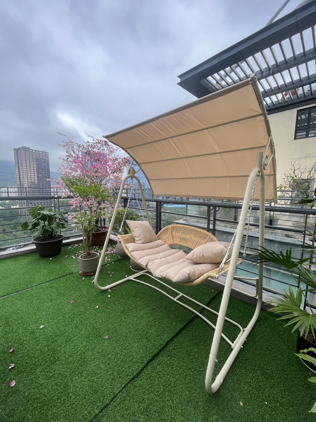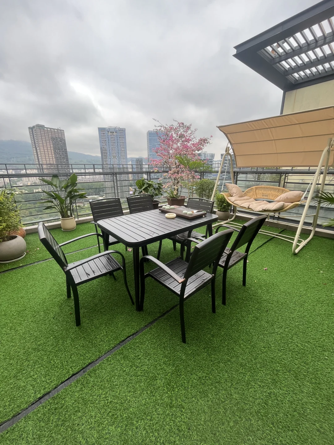 今天要分享的这套房子是纯水岸7期的一套顶楼复式,报价是6500万,一共是三层,顶层上有露台,这个露台房主布置的很漂亮,种了花,放了一个茶台,还有一个秋千椅,适合没事几个朋友一起喝茶聊天。