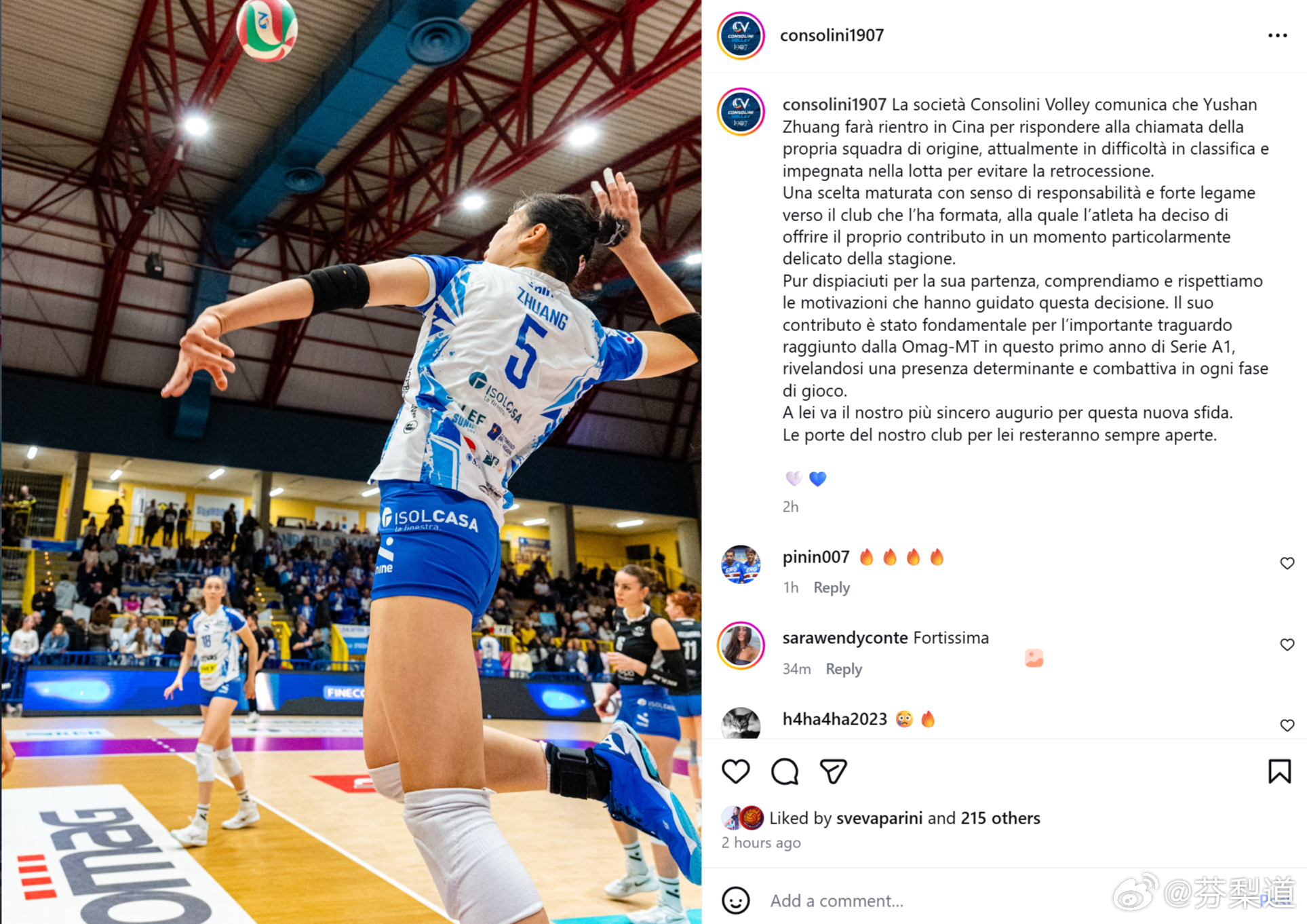 庄宇珊国际排坛动态【圣乔瓦尼官宣:雨刷回国】 圣乔瓦尼排球俱乐部公告: