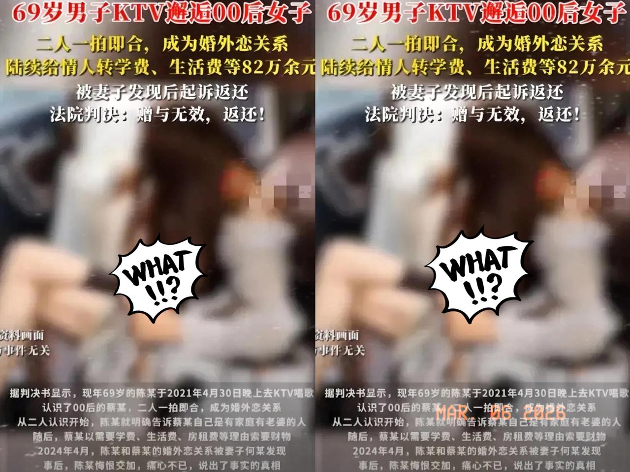 69岁陈大爷在KTV认识00后女孩蔡某,一来二去就成了“男女朋友”。 整整三年,大爷瞒着老伴,偷偷给对方转了82万。 老伴发现后气炸,让他分手,大爷还理直气壮:“你别拦着我找快乐!” 被逼无奈,大爷只好提分手,可对方以学费、房租要钱,大爷怕家丑外扬,又偷偷转了9万多。 结果被老伴发现,大爷直接气到住院。 病一好,大爷又想人家了,各种发消息求复合,两人没多久又好上了。 老伴彻底心寒,直接把大爷赶出家门。 这期间,大爷又给了对方9万多。 直到老伴去世,大爷才清醒过来,跟家人坦白,全家都惊呆了。 最后大爷一怒之下把对方告上法院。 法院判了:返还74万余元+利息! 夫妻共同财产,不是你想送就能送, 婚外情的钱,法律根本不护着。 一时快乐一时爽,最后钱没了、家散了、人也凉了。 你们说,这大爷到底是痴情,还是糊涂?