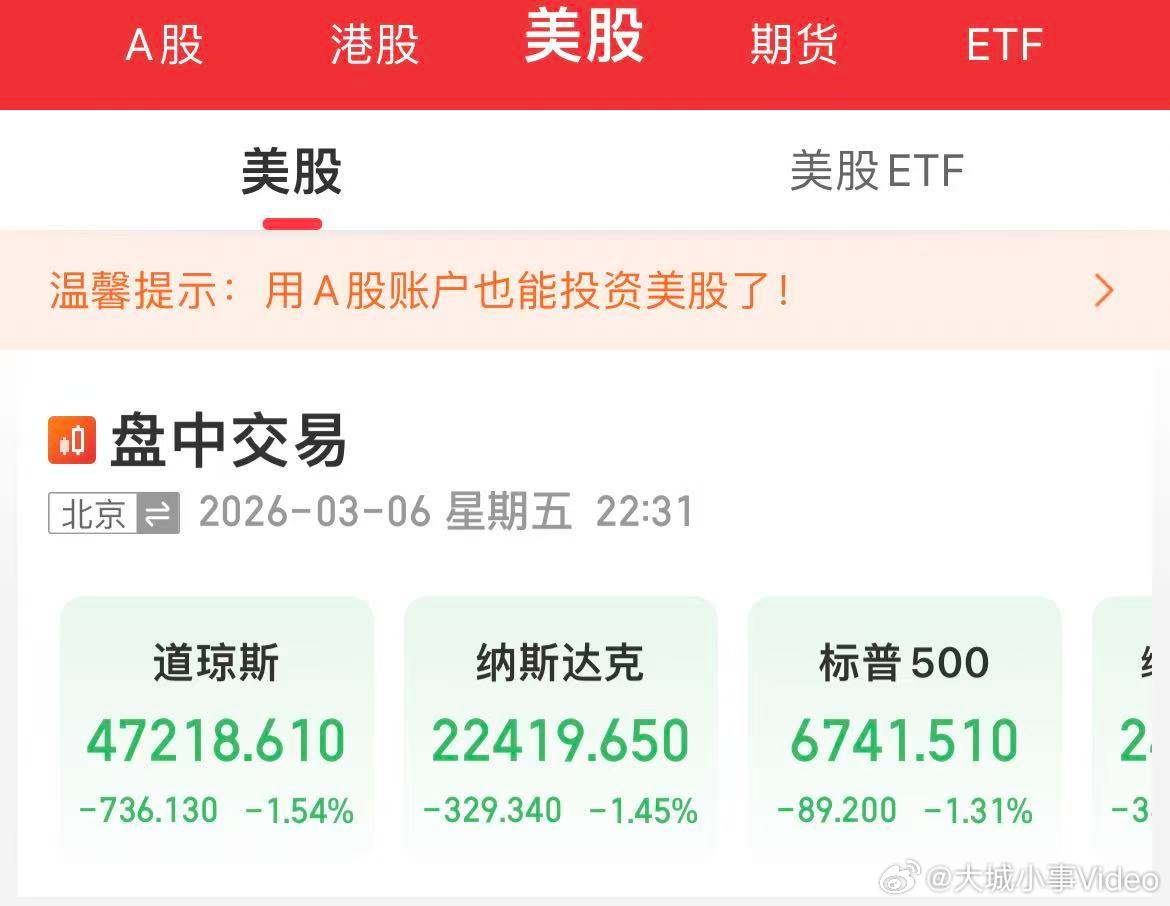 【纳指跌1.45%2月非农爆冷美股集体低开】3月6日,美股开盘,道指跌1.28%,标普500指数跌1.22%,纳指跌1.45%。明星科技股普跌,阿斯麦(ASML.O)跌超5%,台积电(TSM.N)跌近3%,亚马逊(AMZN.O)、英伟达(NVDA.O)、AMD(AMD.O)跌约2%。(金十数据)道指跌1.28%