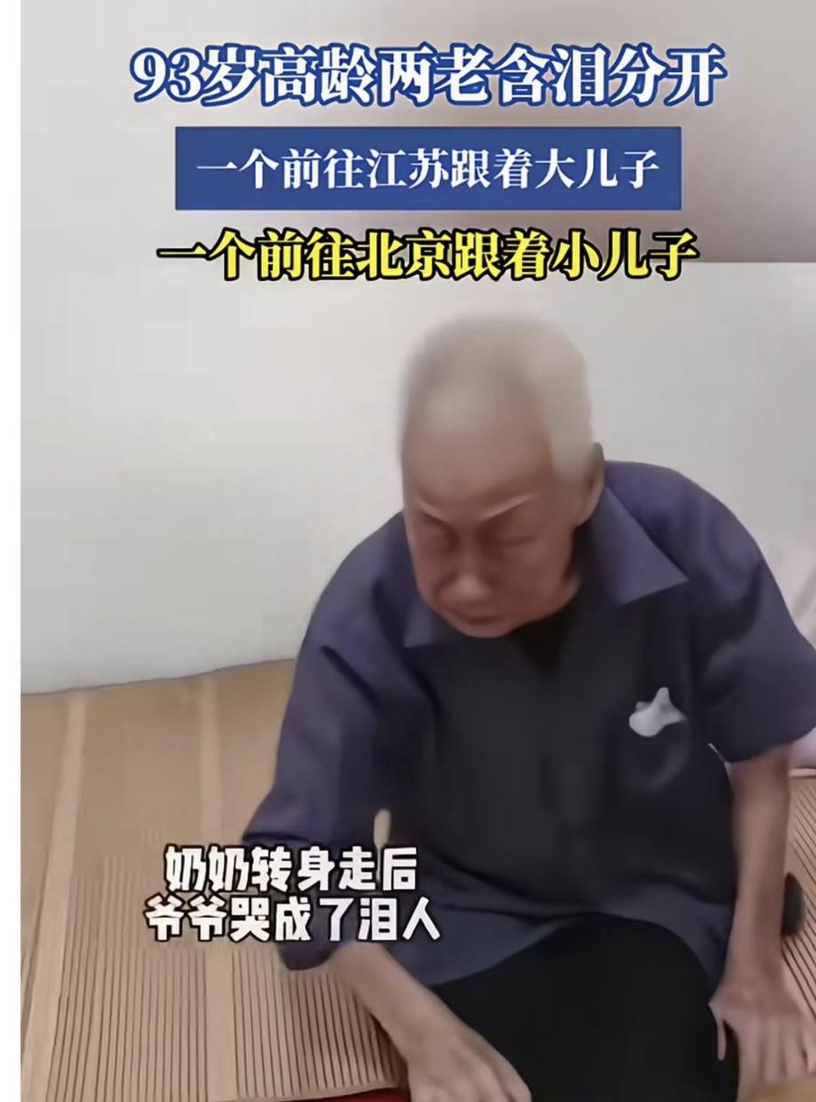 刚刷到一个视频,93岁高龄的两位老人含泪分开,一个随大儿子去江苏,一个跟小儿子去北京。看到这个视频,网友们在评论区都炸开了锅。 A网友:我来说说我的看法,93岁的老人,两个儿子大概率70岁左右了,这已经是需要被赡养的年纪了。如果爷爷奶奶都有退休金还好,如果都没有,那么就相当于这个孙子辈(40左右)的需要养自己父母,岳父岳母,还有自己(10-20岁的孩子)再养一对90多岁的爷爷奶奶,你们摸摸自己的心,真的养的起吗?自己的父母责无旁贷,可是爷爷奶奶终究差了一层,两个儿子能一人养一个,已经很孝顺了,这就是咱们普通老百姓的生活,很现实,很无奈,至少没让老两口自生自灭吧? B网友:老人能把两个孩子一起养大,可惜两个孩子却不能让两个老人一起养老。 C网友:儿子太不懂事,这个年龄你给老两口分开。要不就都接走,要不就不接。这一别会不会他们难再相见? D网友:太残忍了,我也是做儿媳的,我婆婆也生了两个儿子,也不住在一个地方。我绝对不会让二老这样分开的,我不忍心。就当他们只生了一个孩子。 这是大家都会面对的事情,很容易引起共鸣。不是自己的事,看客们说说很容易,自己真遇到,做的不一定更好。 确实很让人动容,这么大岁数,本应相互陪伴安享晚年,却要天各一方。在他们漫长的人生里,携手走过无数风雨,如今却要被迫分隔。这背后可能是子女工作、生活的无奈,可这对老人来说太残忍了。 真心希望子女能多考虑老人的感受,尽量让他们能继续相伴,别让这份晚年的分离成为他们余生的遗憾。