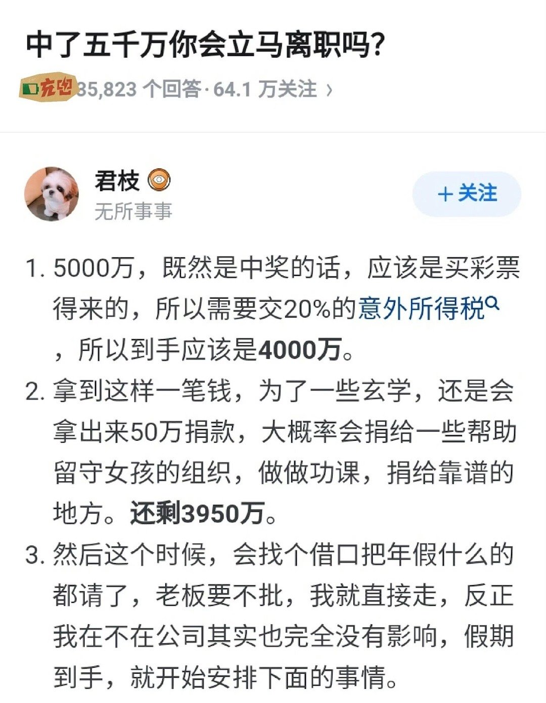 中了五千万你会立马离职吗?