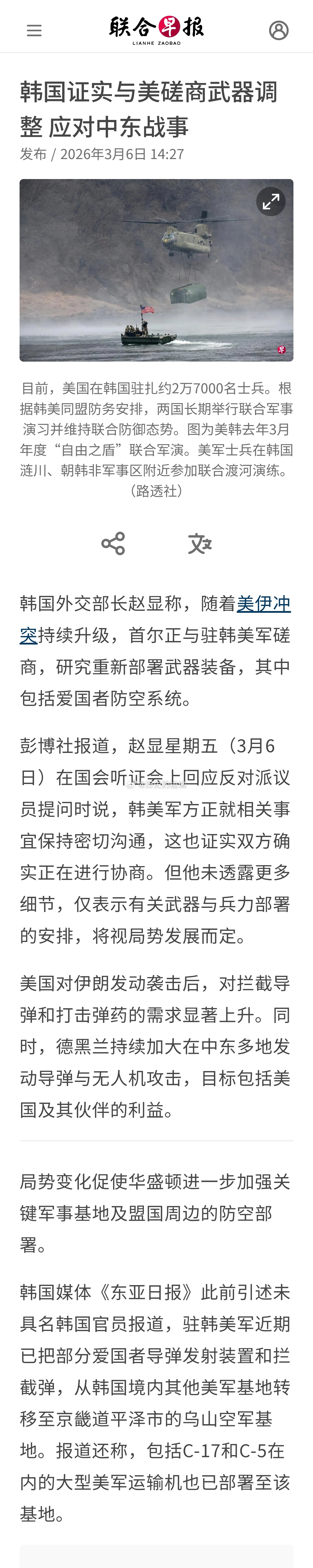 彭博社报道,赵显星期五(3月6日)在国会听证会上回应反对派议员提问时说,韩美军方正就相关事宜保持密切沟通,这也证实双方确实正在进行协商。但他未透露更多细节,仅表示有关武器与兵力部署的安排,将视局势发展而定。