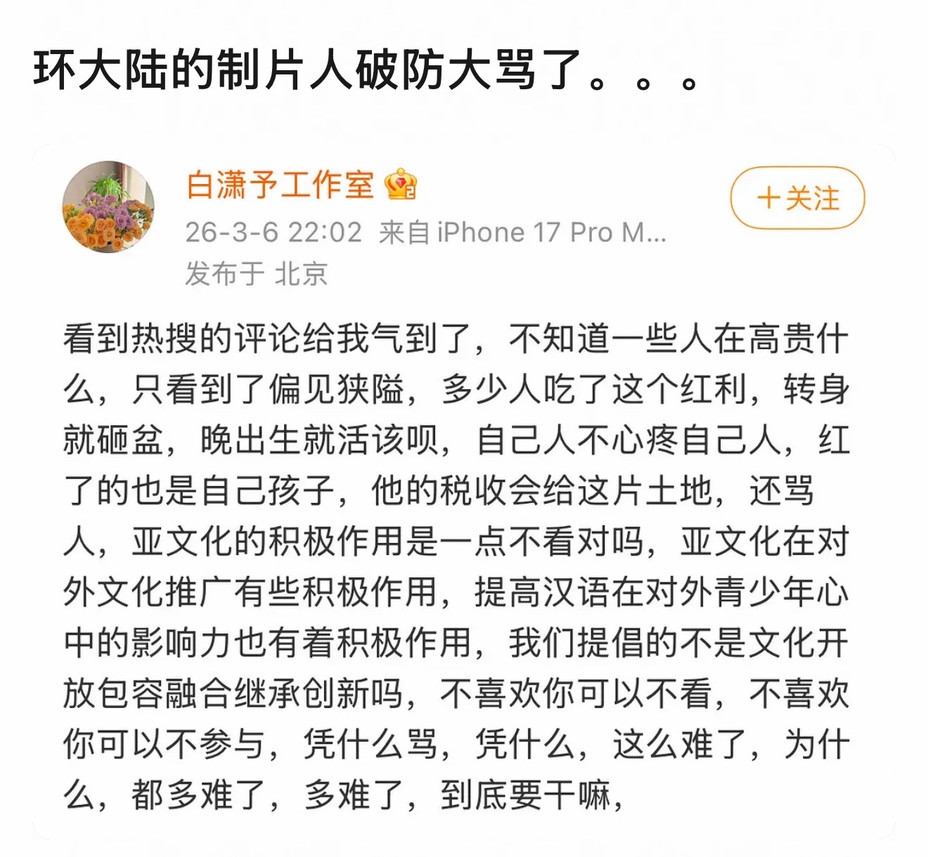 网友不是在讨论何昶希因为拍环大陆《逐玉》被换脸朱赞锦吗 环大陆的制片人破防了 说环大陆剧是为了推广文化宣传汉语