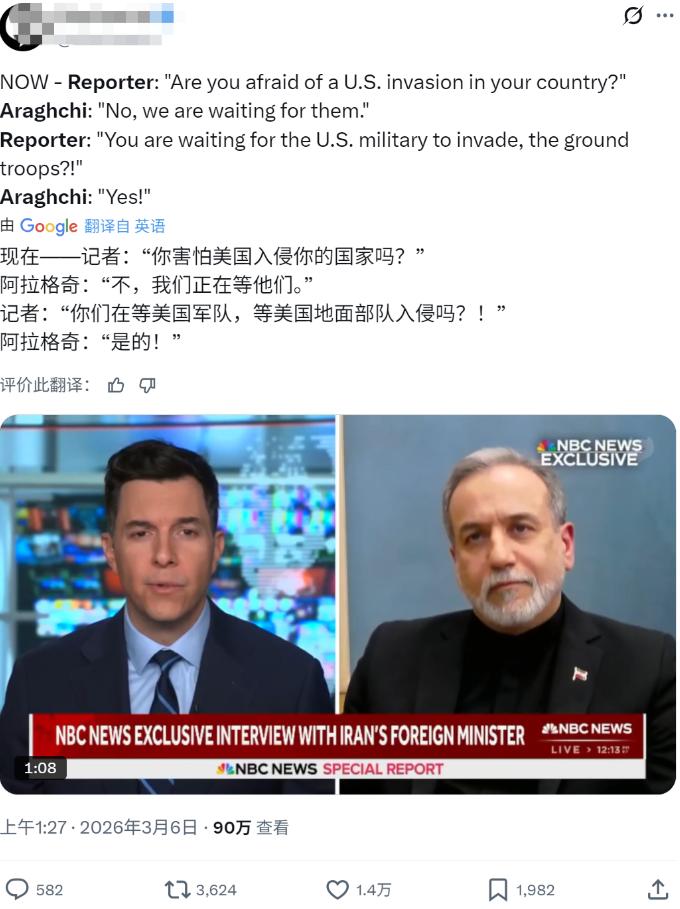 伊朗外长淡定接受美媒采访,在面对是否害怕美国入侵的问题时,阿拉格希面无表情地表示伊朗军队正在等待他们,而从这不难看出,伊朗几乎已经做好了与美军地面进攻的准备,如今中东冲突全面升级,美伊交锋仿佛成了全世界的焦点。 首先咱们要清楚一件事情,那便是美国虽然先针对的伊朗,但走向变成今天这样,估计美国是没有想到的,美方的目的很可能是通过军事“威胁”,来迫使伊朗做出让步,可如今随着哈梅内伊遇害,中东的“火药桶”被彻底引爆。 目前伊朗对以色列、美国进行了多轮袭击,估计美国这些年来,还从未有如此大的损失,如今美国呼吁自己的盟友下场,同时还在为自己填充武器弹药,按照这个趋势发展下去,美伊大概率会发生更大规模的摩擦。