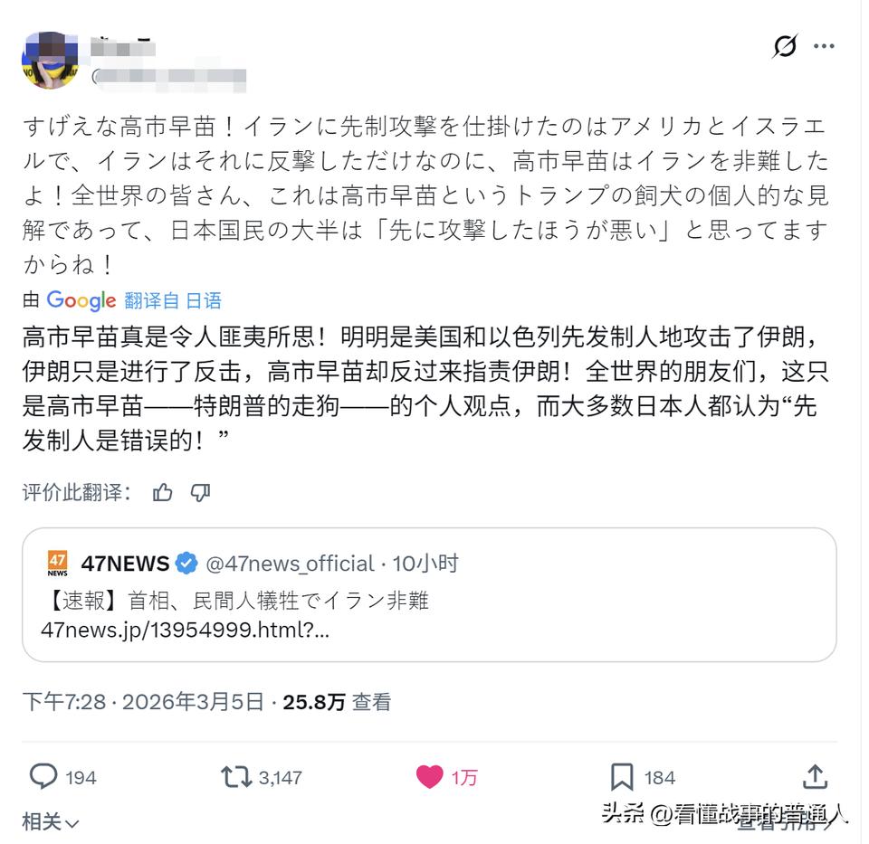 一万个日本人点赞了同一条帖子:高市早苗,你在替谁说话?先动手的是美以,伊朗不过是还击,结果她跑出来批伊朗。日本民间早就憋着这口气,这次当众喷了出来。 事情经过很简单。美以联军2月28日对伊朗发起大规模空袭,1200个目标挨炸,哈梅内伊遇难,伊朗随即启动反击行动。这个先后顺序白纸黑字摆在那里,全世界都看着。高市早苗偏偏选在这个节点跳出来批评伊朗,连"先动手的是谁"都不提,直接把受害方和侵略方的位置悄悄换了个个儿。 日本网民没打算忍。那条帖子的原话直接点名:高市早苗是特朗普的走狗,她说的只是她自己的立场,不代表日本大多数人。这句话一万个日本人用点赞签了名。不是小圈子的抱怨,是实实在在的民间表态。 高市早苗是谁?日本自民党内最鲜明的鹰派之一,长期鼓吹修宪扩军、强化日美同盟,对华强硬立场从未掩饰。她的这套逻辑不是第一次暴露,但伊朗战事把她的底色照得格外清楚——美以先打,她批伊朗,是非判断已经让位给了阵营站队。 麻烦的是,日本普通人越来越看得明白这一套。政客替谁背书,民间心里有数。一万个点赞说明不了全部,但足够说明裂缝已经裂开了。 你怎么看日本民间万人点赞怒批高市早苗这件事? {我的分析,只提供干货!点赞关注 → 热点拆解抢先看 | 评论+转发+收藏,感谢大家支持!往期干货全在主页,【点我头像】直接看!}