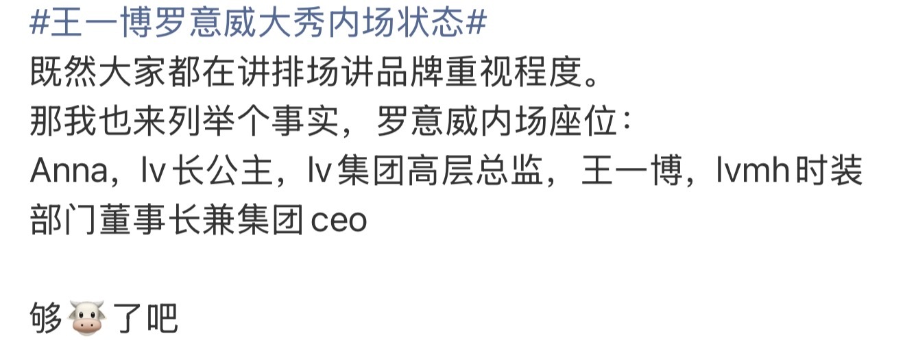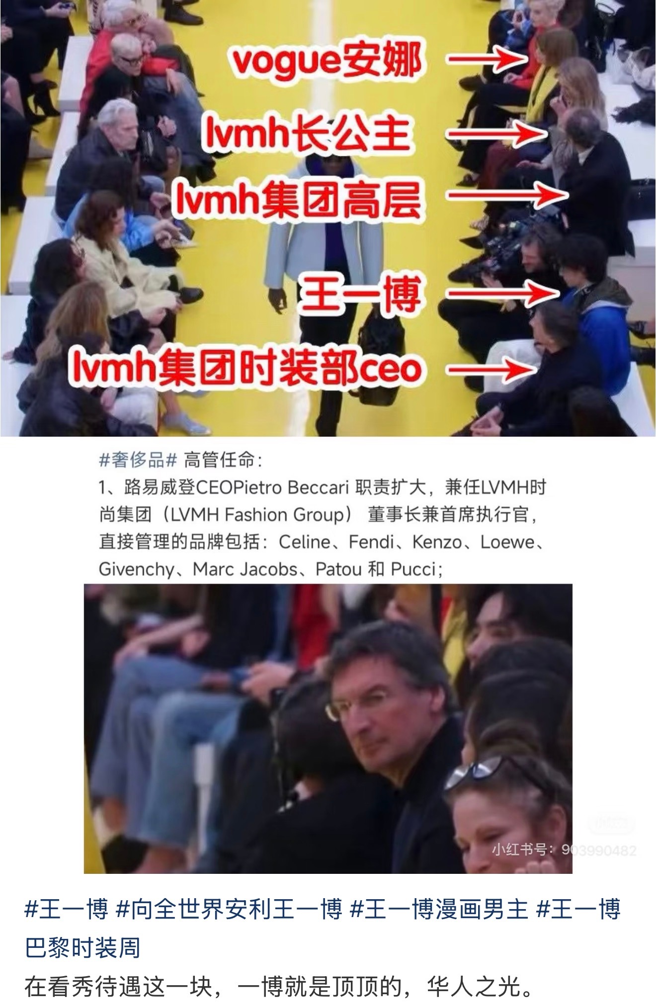 王一博罗意威大秀内场状态王一博罗意威大秀内场待遇🔥全球最高且唯一巨星待遇🔥Anna, lv长公主,lv集团高层总监,王一博,Ivmh时装部门董事长兼集团ceo,1号车进场看秀的。(王一博旁边的那个是lv集团ceo&lv时尚集团董事长)