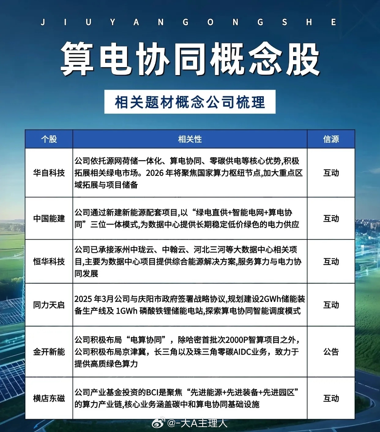 1. 能源与电力保障 * 绿电直供+智能电网:部分公司通过新建新能源项目,采用“绿电直供+智能电网+算电协同”模式,为数据中心提供低价绿色电力(如中国能建)。 * 储能配套:部分公司规划建设大规模储能装备生产线及储能电站,探索算电协同智能调度(如同力天启)。2. 数据中心与算力融合 * 数据中心综合能源解决方案:承接大数据中心项目,为其提供综合能源解决方案,服务算力与电力协同发展(如恒华科技)。 * 算电协同基础设施:产业基金投资聚焦“先进能源+先进装备+先进园区”的算力产业链,核心业务涵盖碳中和算电协同基础设施(如横店东磁)。