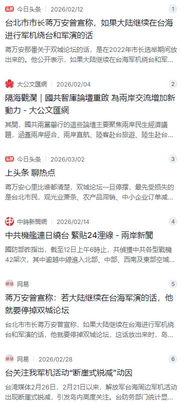 台北市市长蒋万安曾宣称,如果大陆继续在台海进行军机绕台和军演的话,他就要停掉双城论坛。这话放出来时,岛内舆论炸了锅,有人赞他“硬气”,也有人冷笑:“敢说,真敢做吗?” 麻烦看官老爷们右上角点击一下“关注”,既方便您进行讨论和分享,又能给您带来不一样的参与感,感谢您的支持! 蒋万安那句狠话,是在2022年拼市长时放出来的。当时他直接撂下一句:要是大陆继续军机绕台和军演,他就把上海和台北办了十几年的双城论坛给停了。这话一出,岛内立马吵翻了天,有人竖大拇指夸他够硬,敢对大陆叫板;也有人当场泼冷水,冷笑说“话是说得挺狠,真敢做吗?” 说实话,双城论坛可不是那种虚头巴脑的形式主义。从2010年到现在,它一直是两岸间仅存的官方交流平台,雷打不动地办了十几年。每年上海和台北的团队坐下来聊的,都是社区怎么管、垃圾怎么分类、智慧城市怎么建这种老百姓听得懂、也用得上的事儿。后来还延伸到医疗合作、青年创业,实实在在给台北市民带来了不少便利。 拿最近几年的事来说吧,2024年的论坛刚签了智慧医疗合作和小熊猫保育计划,2025年12月蒋万安又亲自带队去了上海,签了水资源治理和职业教育的备忘录。这哪是什么政治秀?这分明是给市民谋福利的务实活儿。就连疫情期间,两岸往来几乎停摆,这个论坛都没断过,硬是靠着视频连线坚持了下来。 蒋万安自己其实比谁都清楚这论坛的分量。他刚选上那会儿,2023年照常率团去上海,2024年又去了,2025年年底那趟虽然因为各种原因从年中拖到12月,最后还是成行了。岛内媒体盯着他的一举一动,有人酸他“态度前后不一致”,毕竟选前放狠话,选后该去还是去,大陆的军事活动也没停,论坛却照办不误。 更有意思的是民意。当时岛内有民调机构专门跟进了这事儿,东森新闻云的数据显示,超过七成的台北市民明确表态支持双城论坛继续办下去,觉得这玩意儿对缓和两岸紧张气氛有用。蒋万安再会算账,也得掂量掂量这七成选票的分量,真要把论坛给停了,第一个跳脚的就是那些指着两岸交流吃饭的中小企业、青年创业者和医疗机构。 所以你看,他虽然嘴上喊得响,动作上却一点没含糊。2025年12月那趟上海行,主题叫“永续城市 韧性前行”,全程低调处理,没搞大张旗鼓的宣示,但该签的协议一份没少。他还在采访里反复强调,两岸越紧张越需要沟通,最怕的就是大家都不说话,最后全凭猜,那才容易出事儿。 其实蒋万安这套操作,明眼人都看得出来是选举套路。2026年又是“九合一”选举年,他得争取连任,中间选民和年轻人的票不能丢。放几句狠话,既能塑造个“敢扛事儿”的硬汉形象,又不至于真把后路给断了。毕竟真要论起政绩,他刚推的“中小学生营养午餐全面免费”政策,直接让18万家庭受惠,那才是实打实的民心工程。 至于大陆这边,态度一直很稳:军机绕台和军演针对的是“台独”势力和外部干涉,不是冲着台湾老百姓来的。国防部也说得明白,这是捍卫国家主权的正当权利,不会因为哪个政客说几句硬话就动摇。国台办那边更是反复表态,只要坚持一个中国原则,两岸交流的大门随时敞开。 说到底,蒋万安心里那本账算得清清楚楚:论坛真要停了,最先倒霉的是台北的中小企业、果农和年轻人。农产品销路断了,观光业萧条了,那些年一点点攒起来的合作全打水漂,这个后果他根本承担不起,也不敢真正去承担。岛内民众那声冷笑,恰恰是看透了他只敢放空炮的本质。 回过头来看,双城论坛能扛过这些年风风雨雨,靠的压根不是哪个政客的表态,而是两岸老百姓要过好日子、要赚钱吃饭的朴素愿望。蒋万安在蓝绿之间左右横跳,既想从两岸交流中捞政绩,又不想被贴标签,这种走钢丝的把戏,短期或许能糊弄过去,但长期看,选民心里跟明镜似的。你要真敢把市民的利益当赌注,那最后输光的,只能是自己那点政治本钱。