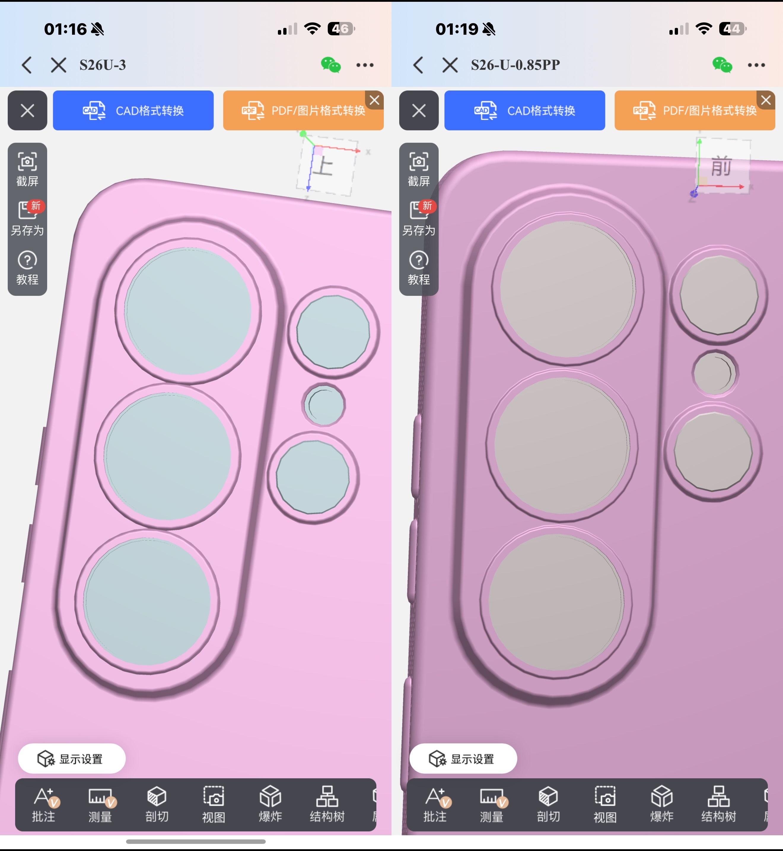 有两个细节。摄像头那三个大圆,我给它整成了完全独立都精孔,而不是那种粘连在一起的精孔(具体区别看图二,都是精孔,只是精得有一丁点不太一样)