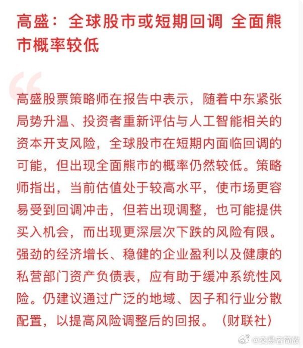 高盛股票策略师在报告中表示,随着中东紧张局势升温、投资者重新评估与人工智能相关的资本开支风险,全球股市在短期内面临回调的可能,但出现全面熊市的概率仍然较低。