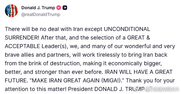 特朗普:除了无条件投降,美国不会与伊朗达成任何协议!