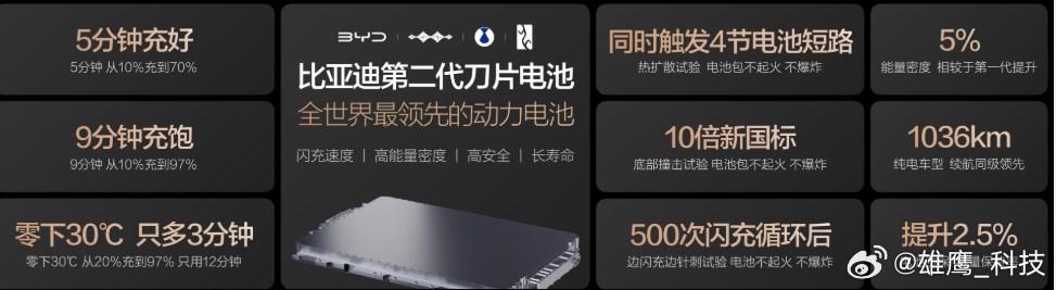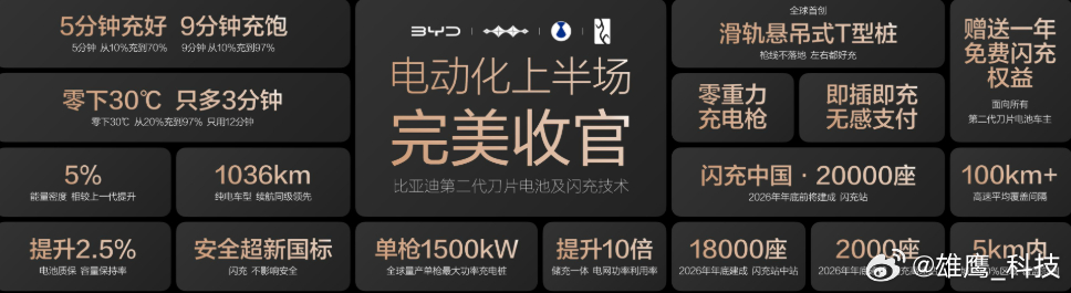 2026年3月5日,比亚迪发布第二代刀片电池和闪充技术,硬核闪充技术树立行业新标杆!常温下5分钟充至70%,9分钟接近充满,零下30度也仅多3分钟,一举攻克“充电慢”和“低温充电难”的痛点,充电如加油般迅速,让新能源汽车迈入闪充时代。