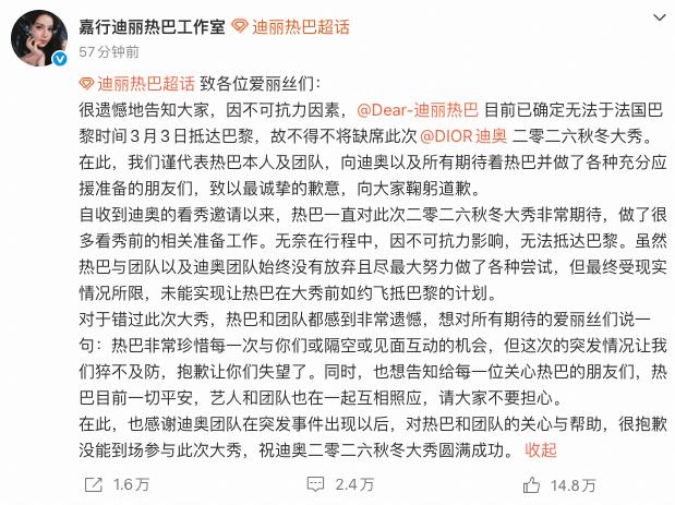 迪丽热巴无法出席 2026 巴黎时装周,网传因转机迪拜滞留机场,目前已离开,为什么不买直飞巴黎机票? Dior全球公关总监发文回应了迪丽热巴缺席今晚大秀,表示热巴一直对时装秀充满期待,因不可抗力未能抵达巴黎深感遗憾,很抱歉让粉丝感到失望。祝愿热巴一切平安顺利,迪奥今晚大秀圆满成功。 迪丽热巴没能出席巴黎时装周,原本安排转机迪拜,却因当地突发情况滞留机场,虽已安全离开,但还是遗憾缺席。