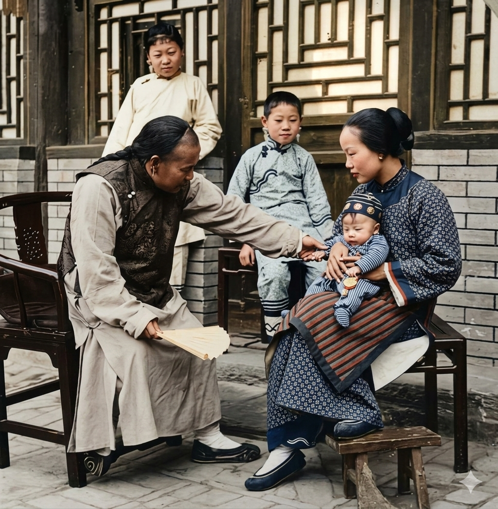 清末民初,一个中式宅院门廊下,一位留着长辫的男子,身体前倾,手臂伸向右侧被女子抱在怀中的婴儿,指尖轻触孩子的小手,神情专注而亲昵,仿佛在逗弄着怀中的宝贝。 右侧的女子梳着传统发髻,服饰带有条纹与精致花边,颈间佩戴着饰品。她低头注视着怀中的婴儿,神情平静而温柔,将孩子稳稳护在臂弯里。婴儿穿着带有花纹的小衣,头戴装饰帽,安静地依偎在她怀中。 在男子身后,站着一位身着浅色立领上衣的年轻女子,耳饰清晰可见,姿态端正地望向镜头;中间的凳子上还坐着另一位少女,服饰上的盘扣与镶边颇为精致,她同样佩戴着耳饰,目光平静地看向画面中心。