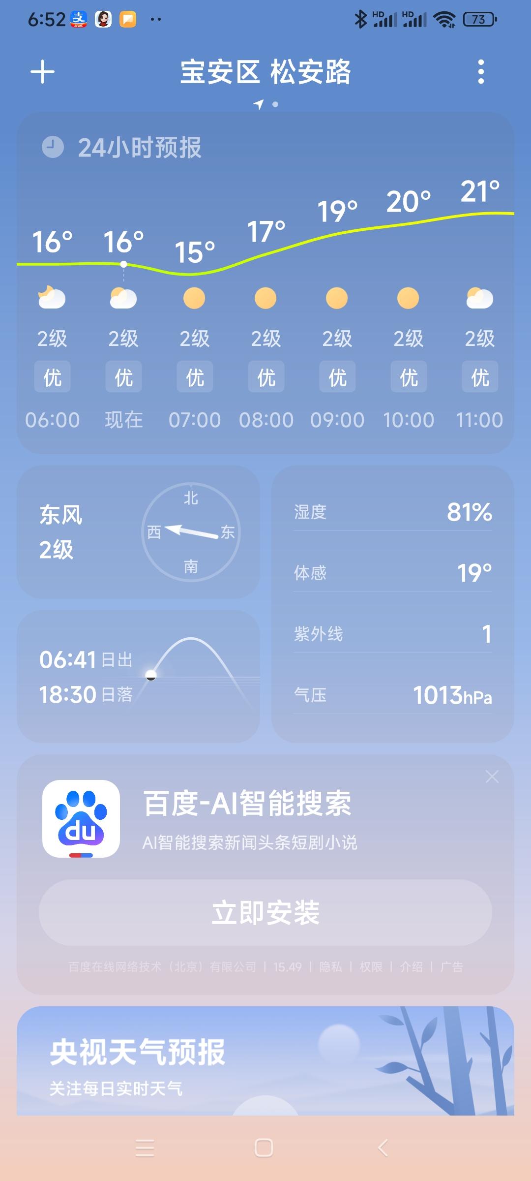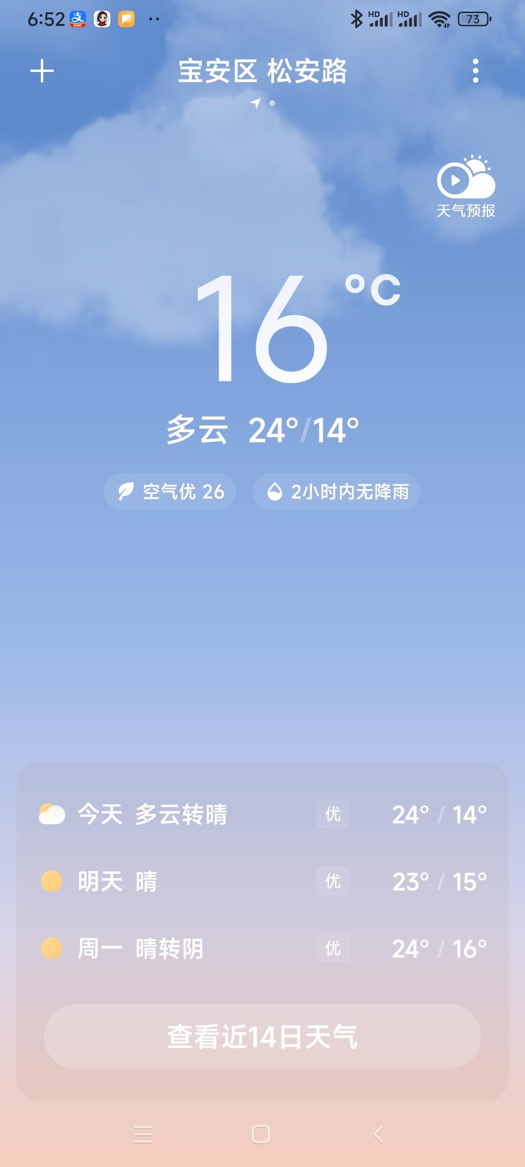 我的今日状态:😁轻松愉快 我这里的天气:☀️晴天:深圳今日多云转晴,气温14度到24度,湿度81度,大家早上好,周六快乐!