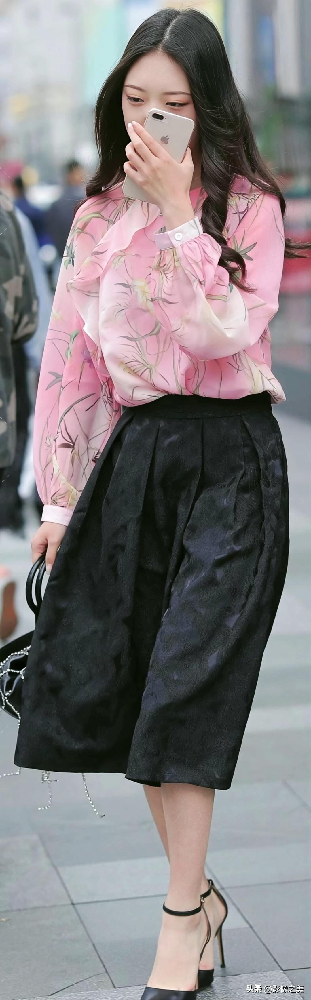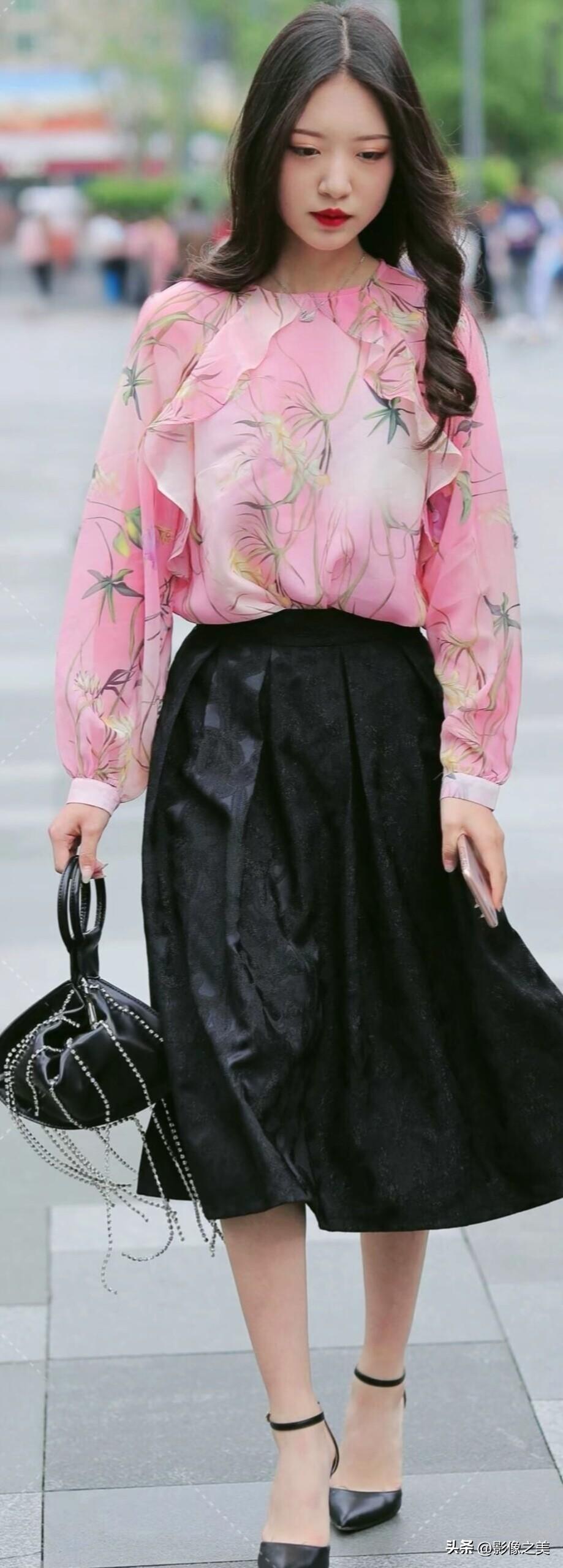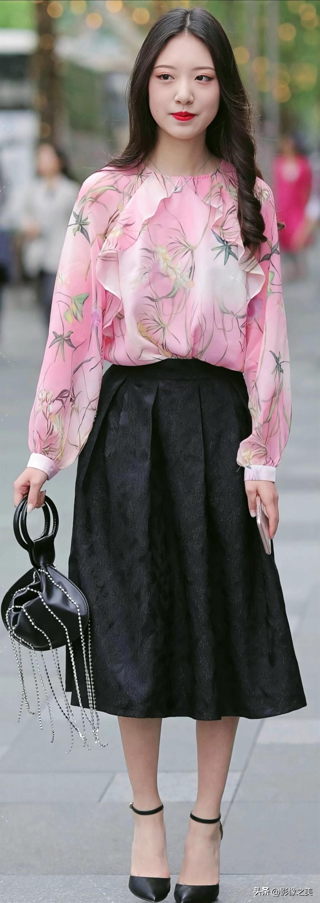 粉调印花雪纺衫搭配黑色提花裙,脚踩细高跟,手提链条包,温柔又不失气场,是春日街头