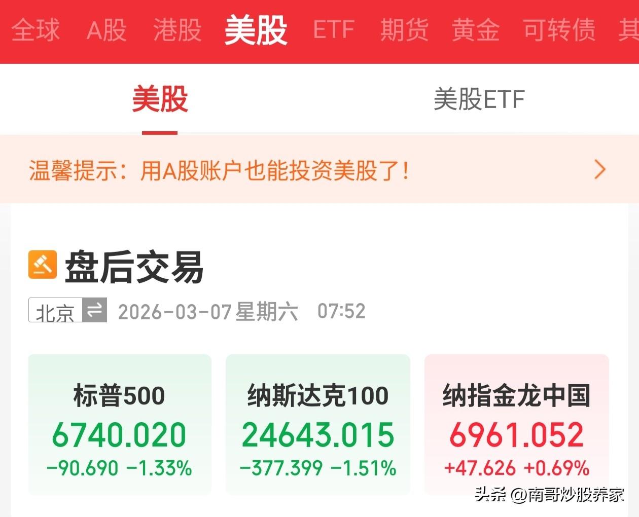 美股早上收盘了。三大指数出现了不同程度的下跌 道琼斯指数0.95%(收出了一个小长腿) 纳斯达克-1.59%(几乎最低价) 标普500-1.33%(几乎最低点) 中国金龙指数0.69%(是唯一红的) 南哥认为造成美股指数持续阴跌的核心因素,有以下 1.拒公布的2月美国非农就业岗位减少9.2万个,表明美国劳动力市场持续面临压力。 2.地缘冲突不停歇,尤其对美国的大型科技股冲击最大。 3.目前为止降息依旧不明朗,多家投行,预测最快在6月底左右才有可能降息。 下周A股很难独善其身,估计大概率会继续走护盘模式,一直等待乌云散去。