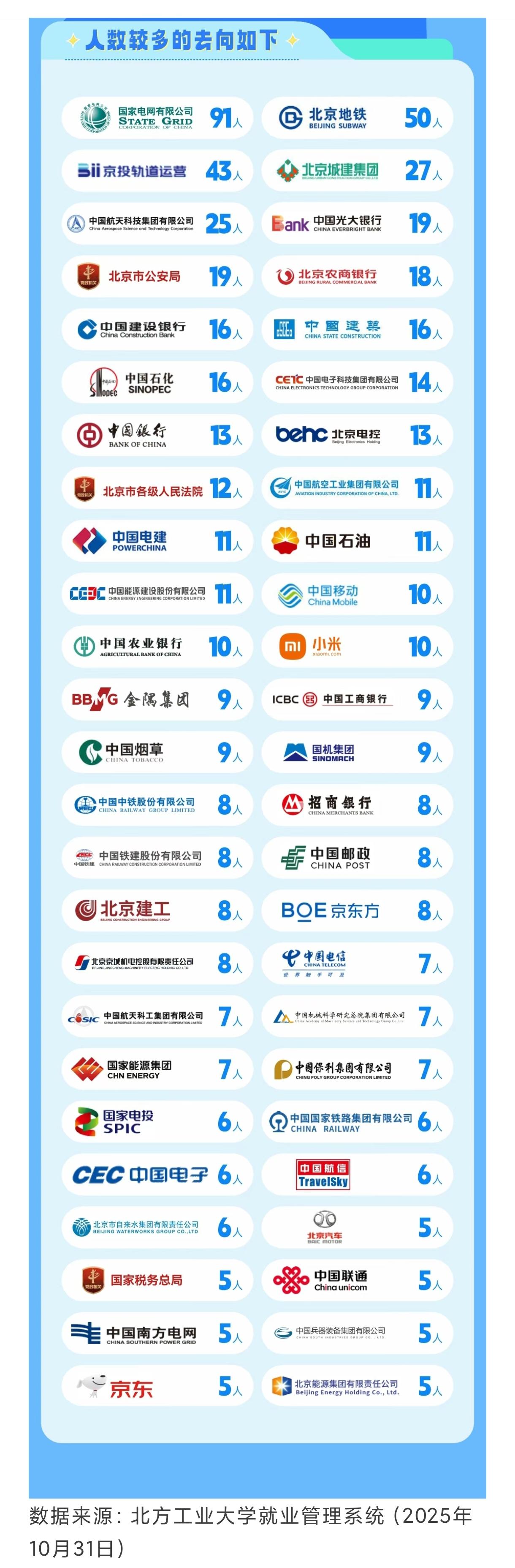 北方工大就是敞亮!在别的高校躲躲闪闪不公布毕业生就业/升学去向时,北方工大大大方方地公布了。不管最终就业升学如何,这个态度就值得点赞,这背后可能还是源自学校强大的自信。 42.19%的本科生深造率,这得超过很多双一流高校了吧,一些弱211高校估计也没有这么高。保研率估计有15%左右,实验班保研更高,26届大数据菁英班保研率达到了41%。深造的学校不乏名校,像清华北大,人大北师大,浙大同济哈工大等都有。 本科生就业率95%,研究生就业率98%,在总体就业环境不太好的情况这个结果还是很不错的。有407名毕业生,进入59家“世界500强”企业工作;有549名毕业生,进入120家“中国500强”企业工作。 国企、机关、事业单位就业比例:选择就业的毕业生中,进入国企、机关、事业单位的比例为49.75%。 北方工大可以说是京城北工大之下最好的工科类大学了,如果想学工科分数又中等的,推荐这所学校。 当然了,北方工大也有竞争对手,那便是近年来风头正劲的北京信息科技大学。两校各有优劣,看个人喜好和专业的选择了。