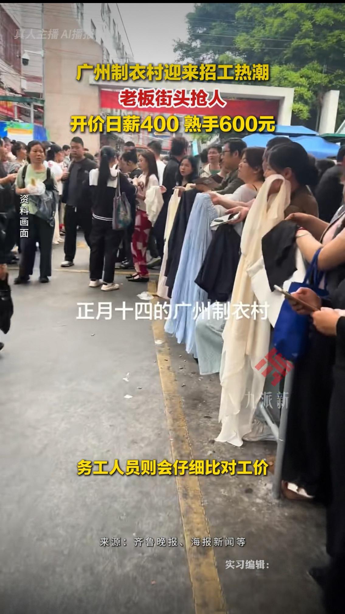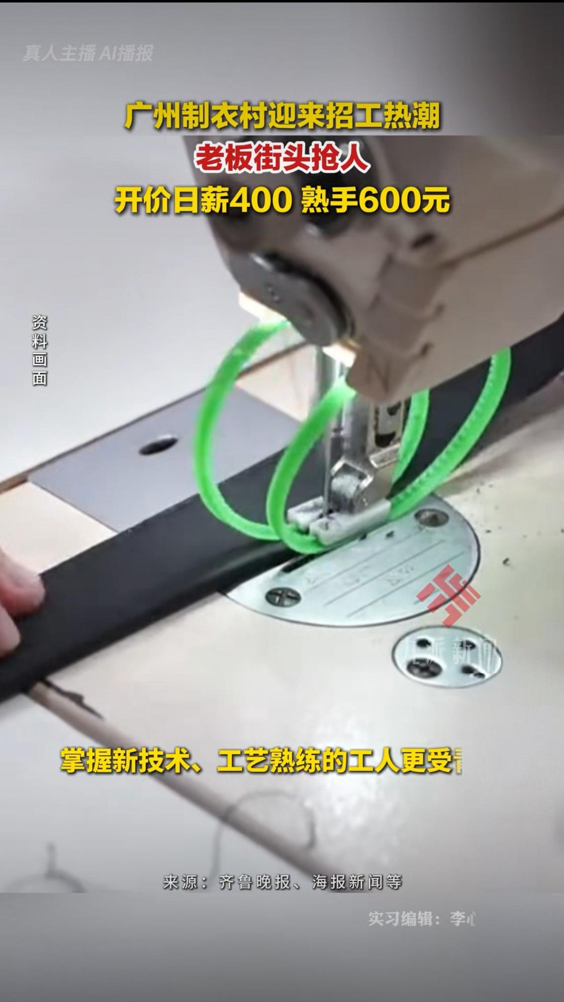 彻底反转!广州制衣村老板街头抢人,日薪600却招不到人,真相太扎心 广州制衣村迎来招工热潮,开价日薪400,熟手直接给到600元,老板们扎堆街头抢人,这一幕看傻了无数网友。 曾经是工人挤破头找活干,如今风水轮流转,变成老板们拿着样衣、举着牌子,在路边排成长队,眼巴巴等着工人挑活儿。只要是手艺过硬的熟手,刚一露面就被好几家老板围住,待遇开了又加,就怕人被抢走。 很多人看着日薪600心动不已,觉得这钱也太好赚了,可只有身在其中的人才懂,这高薪背后,藏着多少不为人知的心酸。这不是福利,是行业被逼到绝境的无奈,是劳动力断层最真实的写照。 现在的制衣行业,早就不是过去批量生产的模式,直播电商带火了小单快反,款式杂、工艺细,没点真本事根本干不了。老一辈工人慢慢退场,年轻人宁愿送外卖、跑网约车,也不愿坐在缝纫机前熬时间,又苦又累还不体面,行业彻底陷入青黄不接的困境。 老板们不是不想少花钱,是没人可招;工人不是不想多赚钱,是这行的苦,早已熬走了一代人。日薪400、600,听起来光鲜,实则是用长时间的高强度劳作换来的,手上的老茧、腰上的病痛,都是赚这份钱的代价。 这一场疯狂的招工潮,看似是劳动力的供不应求,实则是传统制造业转型的阵痛。我们羡慕高薪的同时,更该看见底层打工人的不易,看见一个行业的坚守与无奈。 有人说想去进厂赚钱,可真让你天天守着缝纫机,你能坚持几天?评论区聊聊,你觉得这600元的日薪,值得干吗?广州企业用工