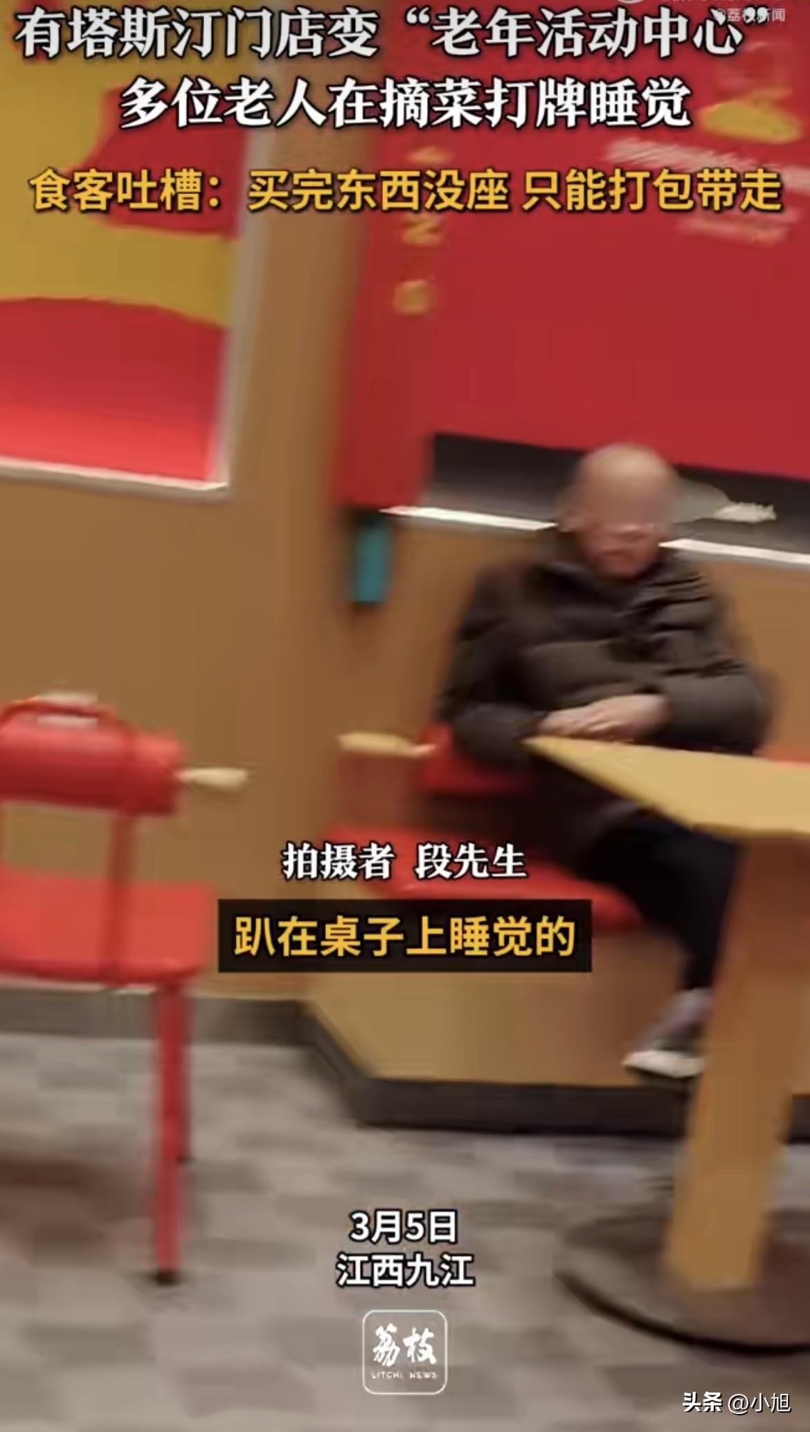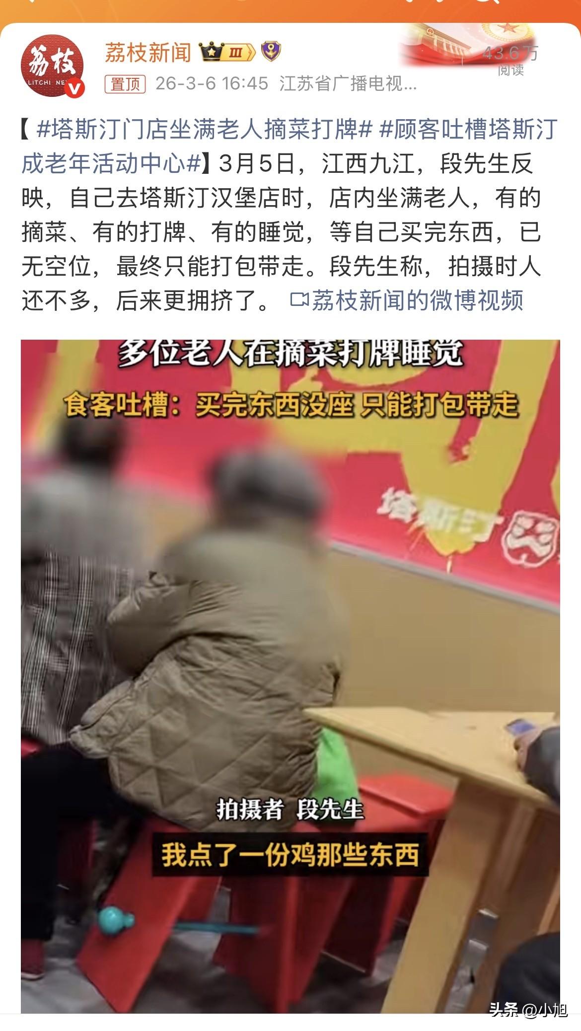 江西九江那家塔斯汀,3月5号那天彻底出圈了。 段先生推门进去的时候,差点以为自己走错了门。摘菜的摘菜,打牌的打牌,睡觉的睡觉。餐桌上一个汉堡都没有,全是菜叶子和扑克牌。等他点完单回头找座,好家伙,连站的地方都快没了。 最后只能打包带走了 这事看着像笑话,细想不是滋味。 先看一组数据。哈尔滨医科大学的调研显示,我国23.76%的老年人存在不同程度的孤独感,其中5%处于深度孤独状态,超26%伴发抑郁、焦虑症状。五个人里就有一个孤独的老人。 这些老人没地儿去。 民政部门统计,南京已经建成街道和社区居家养老服务中心超过1500个,基本实现全覆盖。听起来不少吧?可现实是,很多社区活动中心常年大门锁着,棋牌室堆杂物,图书室落灰。 为啥建了不用?南京理工大学一位副教授专门做过调研,发现关键在选址。老人的几大刚需是吃饭、社交、配药,如果能够一站式解决,这个地方一定人气旺。如果服务站点离得远,又没有安全的步行环境,老人基本就不愿再去了。 那些人气旺的养老服务中心,都设在居民区步行15分钟能到的地方,旁边还有公园。而那些藏在犄角旮旯的,就成了摆设。 新干县那个店员说了一句话挺戳人。那些老人一个月养老金也就两千来块,要是家里开一天空调,电费就干掉十分之一。 快餐店多好。冷气足,有沙发,还不收钱。 但这不只是钱的事。 哈尔滨医科大学的专家分析,老年人退休后经历的岗位角色中断,就像突然踩了刹车,很容易造成群体归属感丧失。作为社会性动物,人始终存在被需要、被认可的心理需求。当工作场域提供的社交网络和价值反馈瞬间消失,家庭结构小型化又削弱了传统代际支持时,老年人极易跌入存在感真空。 翻译成大白话就是:退休了,没人需要你了,你在家待着干啥? 有项研究专门分析了老年人的微信使用情况,发现一个有意思的现象。微信中常联系的亲友数量对老年人孤独感的缓解并未产生明显影响。但可以和常用微信群里的好友聊心里话、经常线下见面的老人,更容易摆脱孤独。 为啥?因为在家庭群里,老人总是报喜不报忧,把消极情绪藏着掖着。面对后辈,还要端着长辈的架子。反倒是跟同龄的老伙伴们,能说点真心话。 那些在塔斯汀摘菜的大爷大妈,他们真的只是蹭空调吗?他们是想找个有人气的地方,待着。 天津日报有篇文章,标题挺扎心:他老了,需要的不只你的电话。 文章里写了个事。重庆79岁的易奶奶独居,女儿打一天电话没人接,火急火燎赶回家,结果老妈正沉浸式追剧,手机早忘厨房了。女儿说,从2022年开始,她经常说希望我多回去陪陪她。 情感需求没法满足的时候,老人开始找平替。有人沉迷短剧,早上看女主在80年代当后妈,中午陪相府嫡女重生复仇,晚上等战神归来。看的时候爽歪歪,看完心里空落落,于是一剧复一剧,恶性循环。 有人被直播间卖保健品的干女儿套牢,抢着下单神药。那些主播张口闭口干爹干妈,金山银山不如你们平平安安。话术夸张荒谬,但干女儿的贴心人设能让老人暂时沉浸在亲情氛围里。 那些在快餐店坐着的大爷大妈,他们何尝不是在找一种平替?替那个回不去的单位,替那个没人说话的家里,替那个一年见不了几次面的子女。 段先生端着汉堡站路边那会儿,不知道有没有想过,再过三四十年,自己会不会也成了那个没地儿去的老人。 快餐店是卖汉堡的,不是开养老院的。但那些拎着菜篮子坐进去的大爷大妈,他们真的只是想凉快一会儿,找人说说话。 你怎么看这事。要是你推门进去发现没地儿坐,你会怎么办。