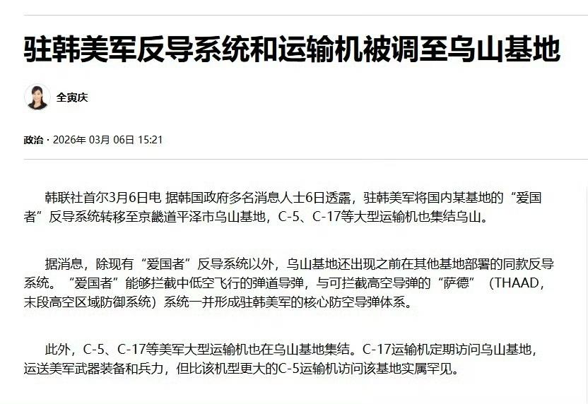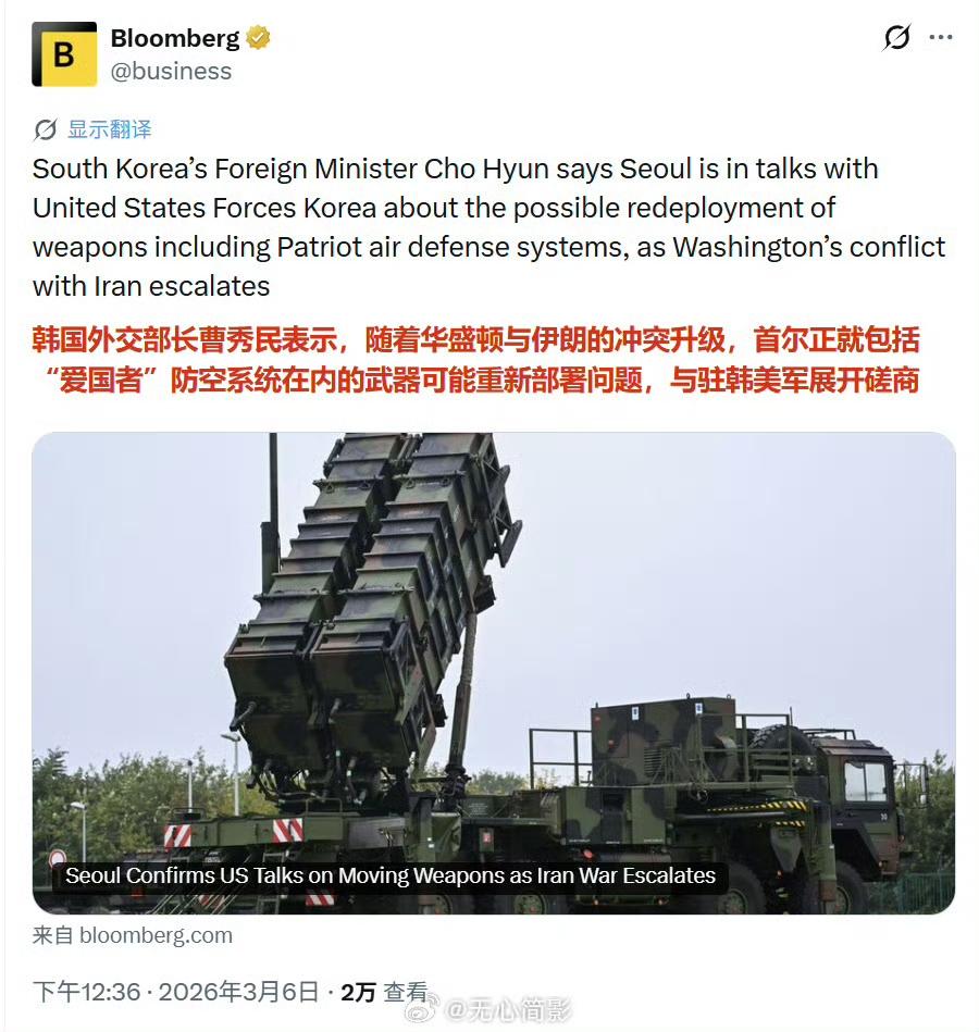 韩联社称,驻韩美军士兵在京畿道平泽市的汉弗莱斯营基地,使用起重机等设备转移 “爱国者” 防空系统发射单元。 美国在去年12月将1000套精确制导炸弹套件从 Osan 空军基地运回美国,这些炸弹可能稍后用于对伊朗的空袭。也说明去年美国已经在准备对伊朗进行军事打击了。