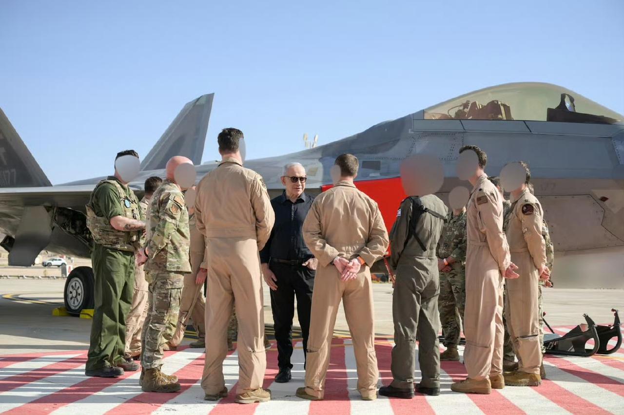 内塔尼亚胡参观部署在以色列奥夫达空军基地的美军F-22隐形战机。此前伊朗空军遭持续打击,防空体系瘫痪、战机大量损毁,基本丧失升空交战能力,这批F-22已无制空作战需求,威慑意义大于实战价值。