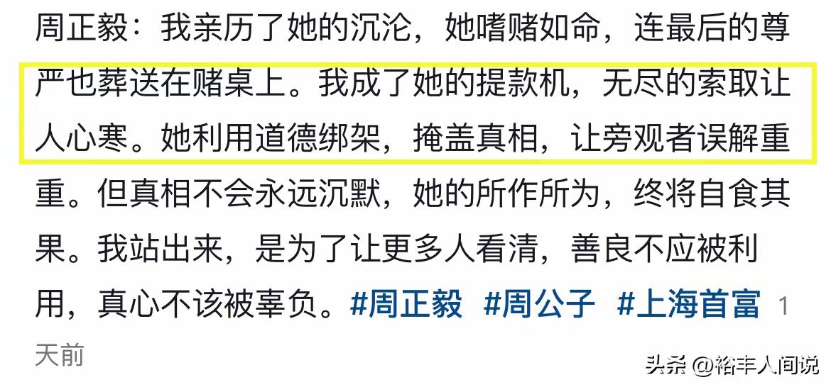 前上海首富周正毅和前女友毛玉萍在自媒体互撕,两个人都算是江湖上有头有脸的人物,现在为了流量也好,或者其他的什么目的,互揭老底。让人不胜感慨! 周正毅说毛玉萍根本不是他老婆,这说的好像没错,毕竟他们也没有领结婚证。但是全上海都知道他们两个当年住在一起,携手从上海底层干到富豪阶层。不是夫妻胜似夫妻,现在周先生一句她根本就不是他老婆,把以前的情分全部一句话抹杀干干净净,让人不胜唏嘘。夫妻本是同林鸟,大难临头各自飞。夫妻尚且如此,情侣更是一地鸡毛。何况他们两个还是半路夫妻,一般这种情况都是各怀心思。如果顺顺利利,顺风顺水,扶摇直上。大家都开开心心。一旦经济状况不佳,那就会为了利益牵扯什么话都说的出来,甚至大打出手的不在少数。 现在他们都已经年过花甲,如今两个人在互联网上面各揭对方短处,一方面失了体面,另一方面也会因此让人觉得男女之情脆弱如斯。