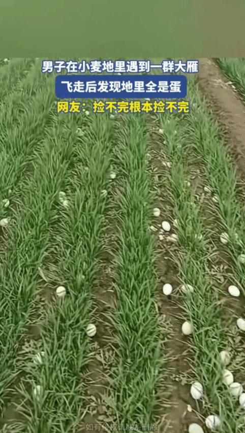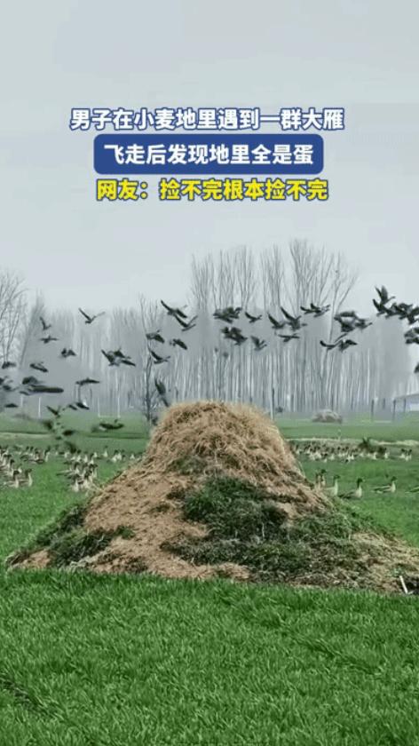 男子在麦地里,发现了乌压压的一群大雁,等它们飞走后,男子发现地里有东西,走近仔细一瞧,他乐了,原来密密麻麻的都是蛋。 春末的麦地已经泛出浓绿,麦秸长得齐膝高,风一吹就掀起层层绿浪,这片被农户精心照料的庄稼地,本该只有麦苗拔节的细碎声响,却在某天迎来了一群不速之客。 种地多年的男子像往常一样去地里查看长势,远远就看见麦田中央黑压压一片,起初以为是成群的麻雀在啄食麦苗,心里顿时一紧,加快脚步想要赶跑这些“偷食者”。 走近了才看清,哪是什么麻雀,竟是一群大雁,密密麻麻地聚集在麦秸丛中,有的低头梳理羽毛,有的在地面上轻轻踱步,偶尔发出几声低低的鸣叫,丝毫没有在意来人的靠近。 男子站在原地没敢动,他这辈子在麦地里见过不少飞鸟,却从没见过这么多大雁聚集在一起,心里又好奇又纳闷,这些大雁放着开阔的湿地不去,怎么偏偏落在了自家的麦地里。 他就那样远远地站着,看着大雁在麦地里停留了大半天,直到夕阳西下,领头的大雁发出一声悠长的鸣叫,这群乌压压的大雁才陆续展开翅膀,排着整齐的队列,缓缓飞向天空,渐渐消失在远方。 看着大雁飞走的背影,男子才松了口气,一边走向麦田中央,一边嘀咕着还好没让麦苗遭了殃。 可刚走到大雁聚集过的地方,他就发现地面有些不对劲,麦秸被压倒了一片,隐约能看到一些灰绿色的东西藏在里面。 他弯腰扒开麦秸,脚下的泥土还带着潮气,一堆灰绿色的蛋整齐地卧在地里,挨挨挤挤,看得人眼晕,不是零散的几个,而是密密麻麻铺了一小片,比他见过的任何鸟蛋都多。 男子瞬间乐了,嘴角忍不住往上扬,活了几十年,还是头一次在自家麦地里见到这么多大雁蛋,伸手想碰一碰,指尖刚碰到蛋壳的微凉,又猛地缩了回来。 他忽然想起以前听人说过,大雁是受保护的鸟类,它们的蛋自然也不能随便乱动,要是私自拿走,说不定还会触犯规矩。 刚才的欢喜渐渐平复,男子小心翼翼地把压倒的麦秸重新盖在蛋上,生怕风吹日晒伤了这些蛋,又在周围做了个简单的标记,提醒自己和路过的人不要靠近。 他知道,这些大雁既然把蛋产在这里,肯定还会回来,自己能做的,就是默默守护好这些小生命,不打扰它们的成长。 后来,他特意咨询了相关人员,才知道这些大雁蛋大多是灰雁的蛋,灰雁属于有重要生态价值的野生动物,私自捡拾、挪动都是不允许的。 男子更加庆幸自己当时没有冲动,每天去地里查看时,都会特意绕开那个区域,看着那些蛋安安静静地躺在麦秸丛中,心里满是踏实。 一场意外的相遇,让男子在麦地里收获了一份惊喜,也收获了一堂生动的保护野生动物的课。 原来人与自然的和谐相处,从来都不是刻意的讨好,而是一份恰到好处的尊重与守护,就像他守护着这片麦地,也守护着大雁留下的这些“希望”,平凡却又温暖。