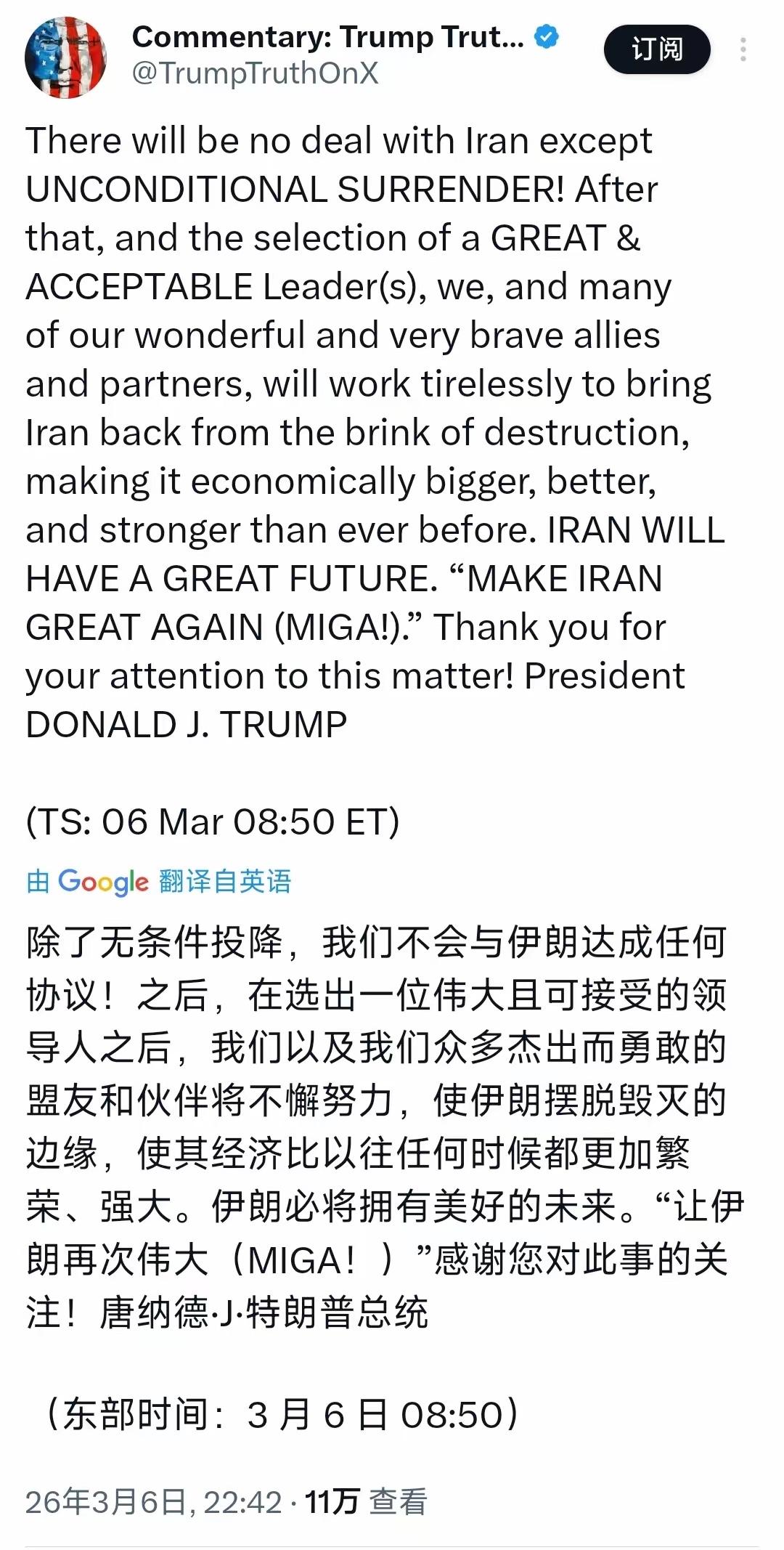 胡言乱语了? 6日,美国总统特朗普发文宣称:“除了无条件投降,我们不会与伊朗达成任何协议!”与此同时,他表示自己要让伊再次伟大MIGA? 着实令人严重怀疑,这老头是不是精神错乱,开始胡言乱语了!所谓“除了无条件投降,不会与伊朗达成任何协议”,“让伊朗再次伟大MIGA”,简直滑稽透顶! 特朗普这番言论纯粹是为了在国内博人眼球,却让美伊关系愈发紧张,地区局势更加不稳定。他真该好好给自己减减压,清醒清醒,别再扰乱国际秩序了,不然月底访华搞不好都要黄!