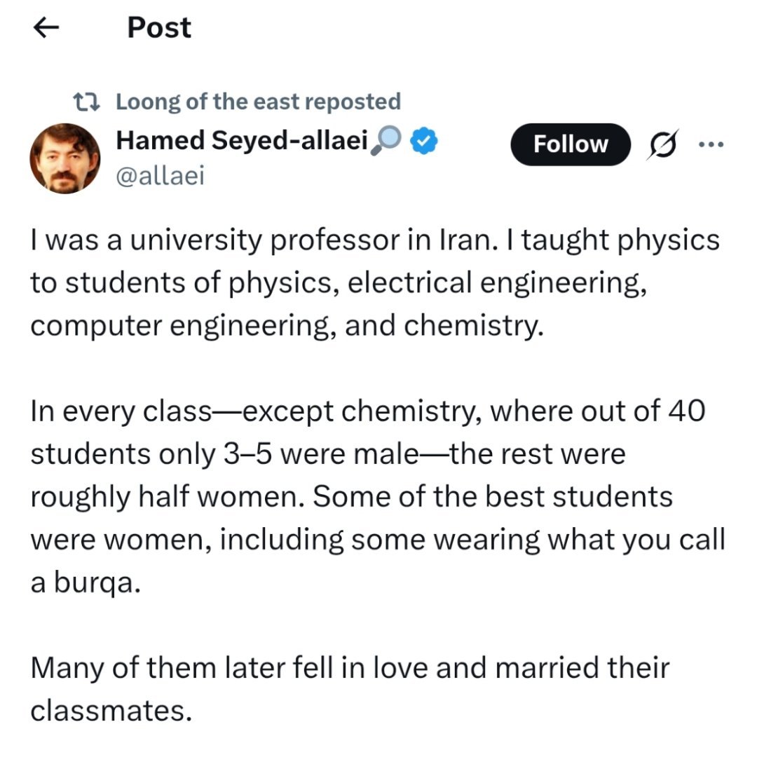 ³ 他说的跟个人见过的、读过的文献一致:伊朗女性的高等教育入学率很高,伊朗社会支持女性接受高等教育。而且很特别的是,伊朗学STEM理工科的女生特别多!热点科普