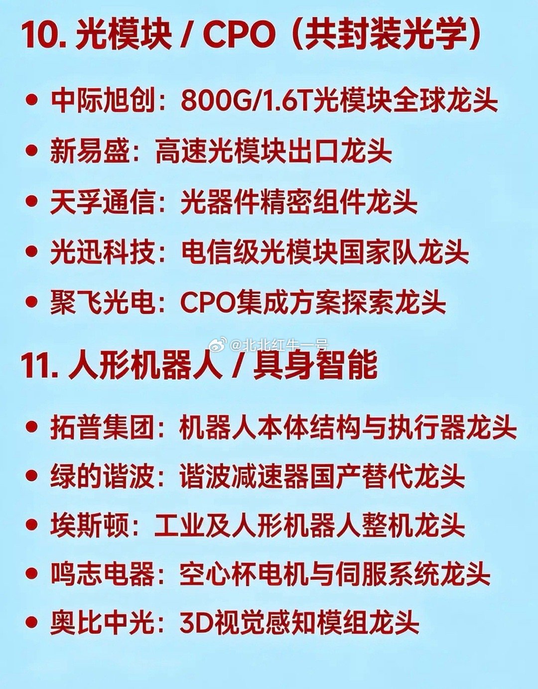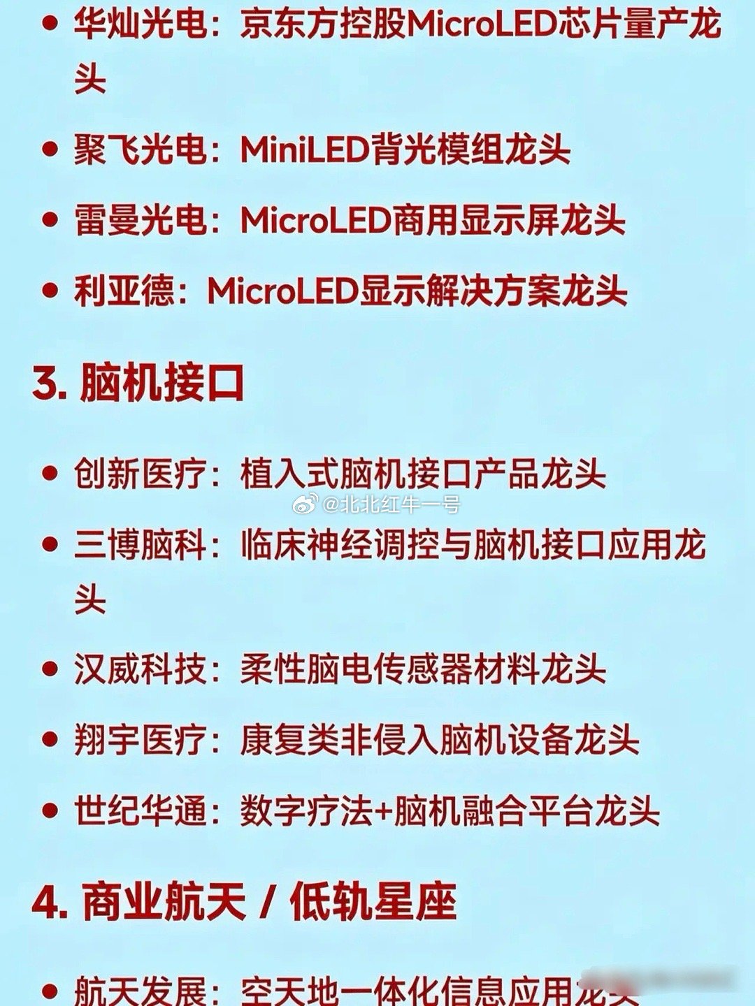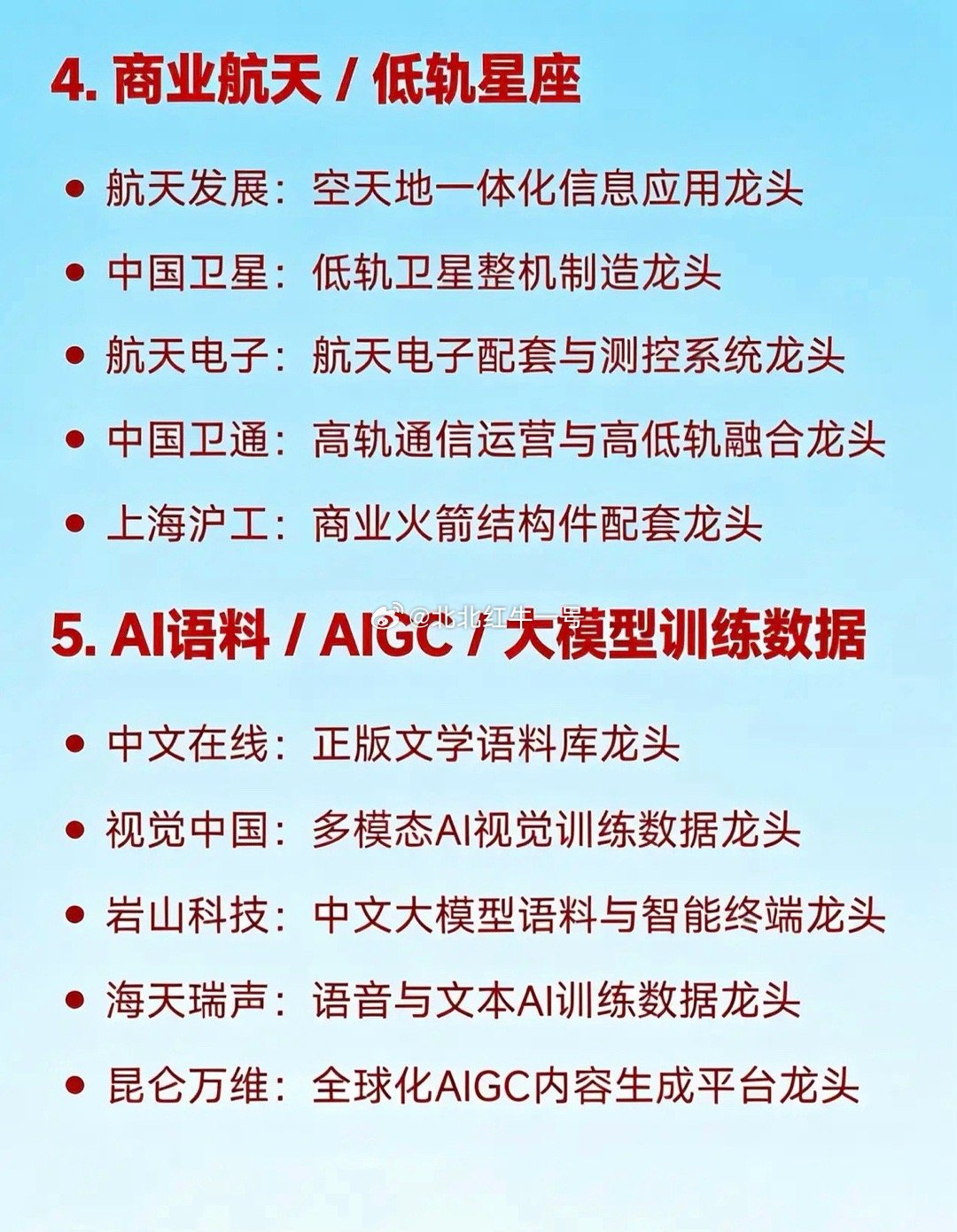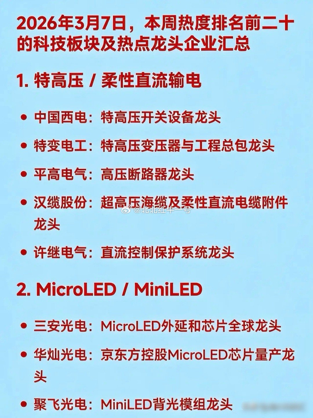 2026年3月7日,本周热度排名前二十的科技板块及热点龙头企业汇总1. 特高压 / 柔性直流输电中国西电:特高压开关设备领军企业特变电工:特高压变压器与工程总包翘楚平高电气:高压断路器龙头企业汉缆股份:超高压海缆及柔性直流电缆附件龙头许继电气:直流控制保护系统龙头2. MicroLED / MiniLED三安光电:MicroLED外延与芯片全球龙头华灿光电:京东方控股的MicroLED芯片量产龙头聚飞光电:MiniLED背光模组龙头雷曼光电:MicroLED商用显示屏龙头利亚德:MicroLED显示解决方案龙头3. 脑机接口创新医疗:植入式脑机接口产品龙头三博脑科:临床神经调控与脑机接口应用龙头汉威科技:柔性脑电传感器材料龙头翔宇医疗:康复类非侵入脑机设备龙头世纪华通:数字疗法+脑机融合平台龙头4. 商业航天 / 低轨星座航天发展:空天地一体化信息应用龙头中国卫星:低轨卫星整机制造龙头航天电子:航天电子配套与测控系统龙头中国卫通:高轨通信运营与高低轨融合龙头上海沪工:商业火箭结构件配套龙头5. AI语料 / AIGC / 大模型训练数据中文在线:正版文学语料库龙头视觉中国:多模态AI视觉训练数据龙头岩山科技:中文大模型语料与智能终端龙头海天瑞声:语音与文本AI训练数据龙头昆仑万维:全球化AIGC内容生成平台龙头6. 天然气 / 油气勘探开发洲际油气:海外油气田运营龙头山东墨龙:油气钻采装备国产替代龙头通源石油:页岩气压裂服务龙头准油股份:油田技术服务龙头中国石油:上游原油天然气开采龙头7. 可控核聚变 / 核能东方电气:ITER核聚变装置关键设备龙头上海电气:核电主设备与蒸汽发生器龙头宝胜股份:核级特种电缆龙头久立特材:核级不锈钢管龙头顺钠股份:聚变电源与磁体支撑系统龙头8. 第三代半导体(SiC/GaN)三安光电:碳化硅衬底与器件IDM龙头派瑞股份:碳化硅功率器件军用龙头华灿光电:GaN电力电子器件量产龙头天岳先进:半绝缘SiC衬底龙头东尼电子:SiC导电衬底量产龙头9. 智能电网 / 虚拟电厂 / 新型电力系统国电南瑞:电网调度自动化龙头积成电子:配电网自动化终端龙头南网数字:南方电网数字化平台龙头远光软件:虚拟电厂能源管理软件龙头金智科技:分布式能源控制系统龙头10. 光模块 / CPO(共封装光学)中际旭创:800G/1.6T光模块全球龙头新易盛:高速光模块出口龙头天孚通信:光器件精密组件龙头光迅科技:电信级光模块国家队龙头聚飞光电:CPO集成方案探索龙头11. 人形机器人 / 具身智能拓普集团:机器人本体结构与执行器龙头绿的谐波:谐波减速器国产替代龙头埃斯顿:工业及人形机器人整机龙头鸣志电器:空心杯电机与伺服系统龙头奥比中光:3D视觉感知模组龙头12. 低空经济亿航智能:载人eVTOL整机适航龙头中信海直:低空飞行运营与起降场建设龙头万丰奥威:通用航空飞机制造龙头宗申动力:航空活塞发动机龙头航发科技:航空发动机零部件龙头13. 量子科技国盾量子:量子密钥分发(QKD)设备龙头科大国创:量子计算软件与行业应用龙头浙大网新:量子通信网络集成龙头14. 创新药 / 生物医药亚虹医药:光动力治疗创新药上市龙头百济神州:全球肿瘤创新药研发龙头药明康德:CXO全产业链服务龙头恒瑞医药:国内创新药管线龙头迈瑞医疗:高端医疗设备国产替代龙头15. 农业种植 / 粮食安全 / 乡村振兴亚盛集团:西北规模化农业种植龙头北大荒:商品粮生产与土地资源龙头苏垦农发:国有农场粮食生产龙头16. 小金属 / 锶矿 / 天青石金瑞矿业:国内锶矿资源储量与产能龙头17. 婴童 / 育儿 / 美容护理延江股份:高端卫生用品材料原龙头(现转型IC基板)18. 新能源汽车热管理 / 动力电池安全固德电材:动力电池热失控防护材料龙头19. 半导体设备 / 先进封装北方华创:PVD/CVD/刻蚀设备平台龙头中微公司:CCP刻蚀设备国产龙头长电科技:Chiplet先进封装全球龙头华海清科:CMP设备国产替代龙头精测电子:半导体检测设备龙头20. 算力基础设施 / 智算中心 / 算电协同浪潮信息:AI服务器整机出货龙头紫光股份:算力网络与交换设备龙头华胜天成:华为智算中心生态合作龙头数据港:一线城市智算中心IDC龙头东阳光:字节跳动数据中心资产收购龙头