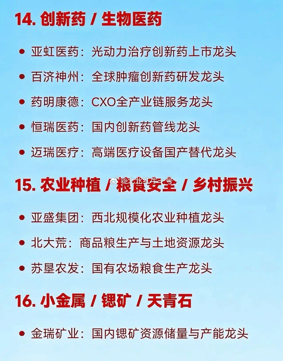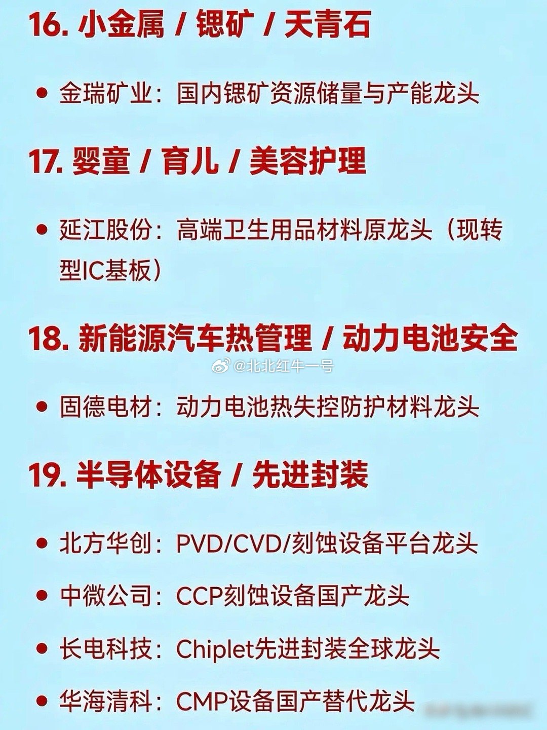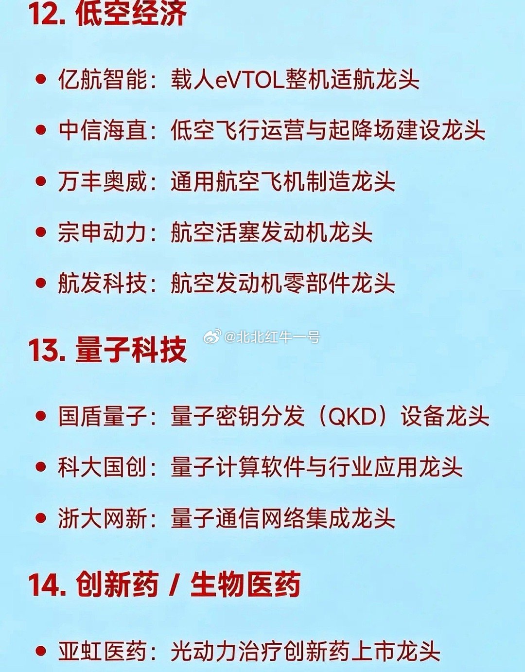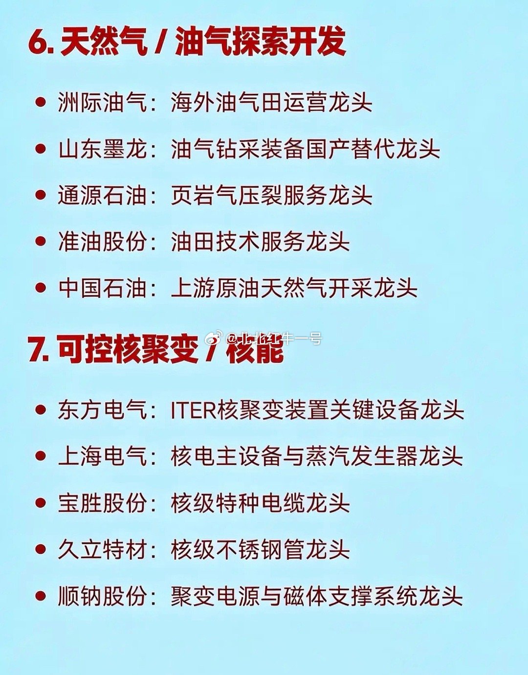 2026年3月7日,本周热度排名前二十的科技板块及热点龙头企业汇总1. 特高压 / 柔性直流输电中国西电:特高压开关设备领军企业特变电工:特高压变压器与工程总包翘楚平高电气:高压断路器龙头企业汉缆股份:超高压海缆及柔性直流电缆附件龙头许继电气:直流控制保护系统龙头2. MicroLED / MiniLED三安光电:MicroLED外延与芯片全球龙头华灿光电:京东方控股的MicroLED芯片量产龙头聚飞光电:MiniLED背光模组龙头雷曼光电:MicroLED商用显示屏龙头利亚德:MicroLED显示解决方案龙头3. 脑机接口创新医疗:植入式脑机接口产品龙头三博脑科:临床神经调控与脑机接口应用龙头汉威科技:柔性脑电传感器材料龙头翔宇医疗:康复类非侵入脑机设备龙头世纪华通:数字疗法+脑机融合平台龙头4. 商业航天 / 低轨星座航天发展:空天地一体化信息应用龙头中国卫星:低轨卫星整机制造龙头航天电子:航天电子配套与测控系统龙头中国卫通:高轨通信运营与高低轨融合龙头上海沪工:商业火箭结构件配套龙头5. AI语料 / AIGC / 大模型训练数据中文在线:正版文学语料库龙头视觉中国:多模态AI视觉训练数据龙头岩山科技:中文大模型语料与智能终端龙头海天瑞声:语音与文本AI训练数据龙头昆仑万维:全球化AIGC内容生成平台龙头6. 天然气 / 油气勘探开发洲际油气:海外油气田运营龙头山东墨龙:油气钻采装备国产替代龙头通源石油:页岩气压裂服务龙头准油股份:油田技术服务龙头中国石油:上游原油天然气开采龙头7. 可控核聚变 / 核能东方电气:ITER核聚变装置关键设备龙头上海电气:核电主设备与蒸汽发生器龙头宝胜股份:核级特种电缆龙头久立特材:核级不锈钢管龙头顺钠股份:聚变电源与磁体支撑系统龙头8. 第三代半导体(SiC/GaN)三安光电:碳化硅衬底与器件IDM龙头派瑞股份:碳化硅功率器件军用龙头华灿光电:GaN电力电子器件量产龙头天岳先进:半绝缘SiC衬底龙头东尼电子:SiC导电衬底量产龙头9. 智能电网 / 虚拟电厂 / 新型电力系统国电南瑞:电网调度自动化龙头积成电子:配电网自动化终端龙头南网数字:南方电网数字化平台龙头远光软件:虚拟电厂能源管理软件龙头金智科技:分布式能源控制系统龙头10. 光模块 / CPO(共封装光学)中际旭创:800G/1.6T光模块全球龙头新易盛:高速光模块出口龙头天孚通信:光器件精密组件龙头光迅科技:电信级光模块国家队龙头聚飞光电:CPO集成方案探索龙头11. 人形机器人 / 具身智能拓普集团:机器人本体结构与执行器龙头绿的谐波:谐波减速器国产替代龙头埃斯顿:工业及人形机器人整机龙头鸣志电器:空心杯电机与伺服系统龙头奥比中光:3D视觉感知模组龙头12. 低空经济亿航智能:载人eVTOL整机适航龙头中信海直:低空飞行运营与起降场建设龙头万丰奥威:通用航空飞机制造龙头宗申动力:航空活塞发动机龙头航发科技:航空发动机零部件龙头13. 量子科技国盾量子:量子密钥分发(QKD)设备龙头科大国创:量子计算软件与行业应用龙头浙大网新:量子通信网络集成龙头14. 创新药 / 生物医药亚虹医药:光动力治疗创新药上市龙头百济神州:全球肿瘤创新药研发龙头药明康德:CXO全产业链服务龙头恒瑞医药:国内创新药管线龙头迈瑞医疗:高端医疗设备国产替代龙头15. 农业种植 / 粮食安全 / 乡村振兴亚盛集团:西北规模化农业种植龙头北大荒:商品粮生产与土地资源龙头苏垦农发:国有农场粮食生产龙头16. 小金属 / 锶矿 / 天青石金瑞矿业:国内锶矿资源储量与产能龙头17. 婴童 / 育儿 / 美容护理延江股份:高端卫生用品材料原龙头(现转型IC基板)18. 新能源汽车热管理 / 动力电池安全固德电材:动力电池热失控防护材料龙头19. 半导体设备 / 先进封装北方华创:PVD/CVD/刻蚀设备平台龙头中微公司:CCP刻蚀设备国产龙头长电科技:Chiplet先进封装全球龙头华海清科:CMP设备国产替代龙头精测电子:半导体检测设备龙头20. 算力基础设施 / 智算中心 / 算电协同浪潮信息:AI服务器整机出货龙头紫光股份:算力网络与交换设备龙头华胜天成:华为智算中心生态合作龙头数据港:一线城市智算中心IDC龙头东阳光:字节跳动数据中心资产收购龙头